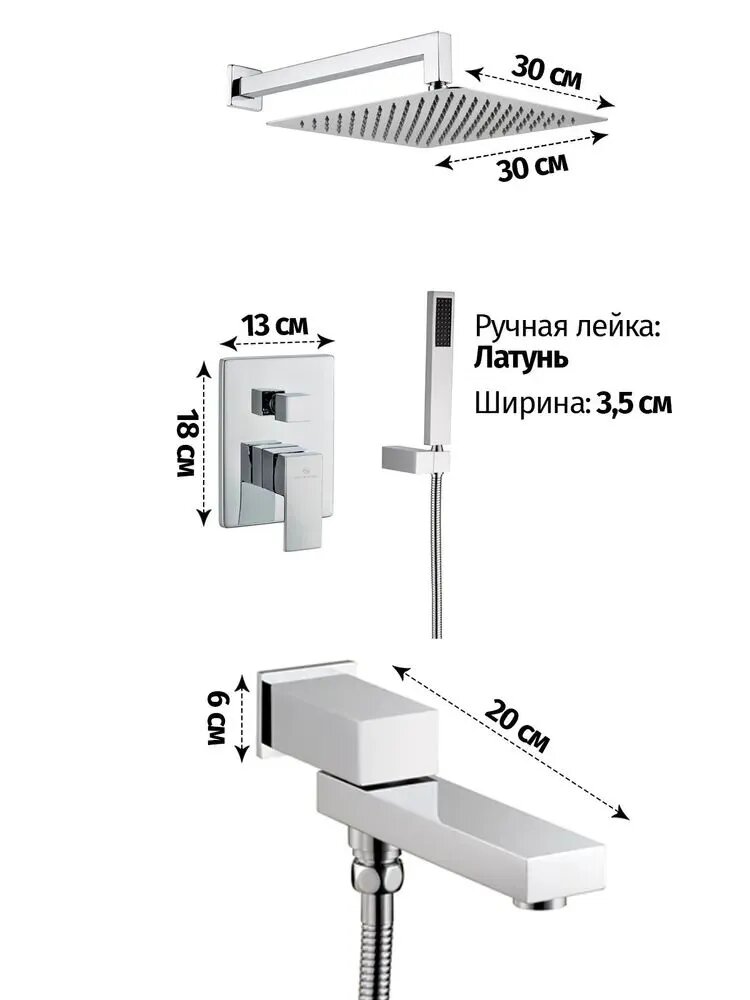 | Комплектация | вентиль / верхний душ / держатель лейки / кронштейн для верхнего душа / ручной душ / Смеситель / шланг |