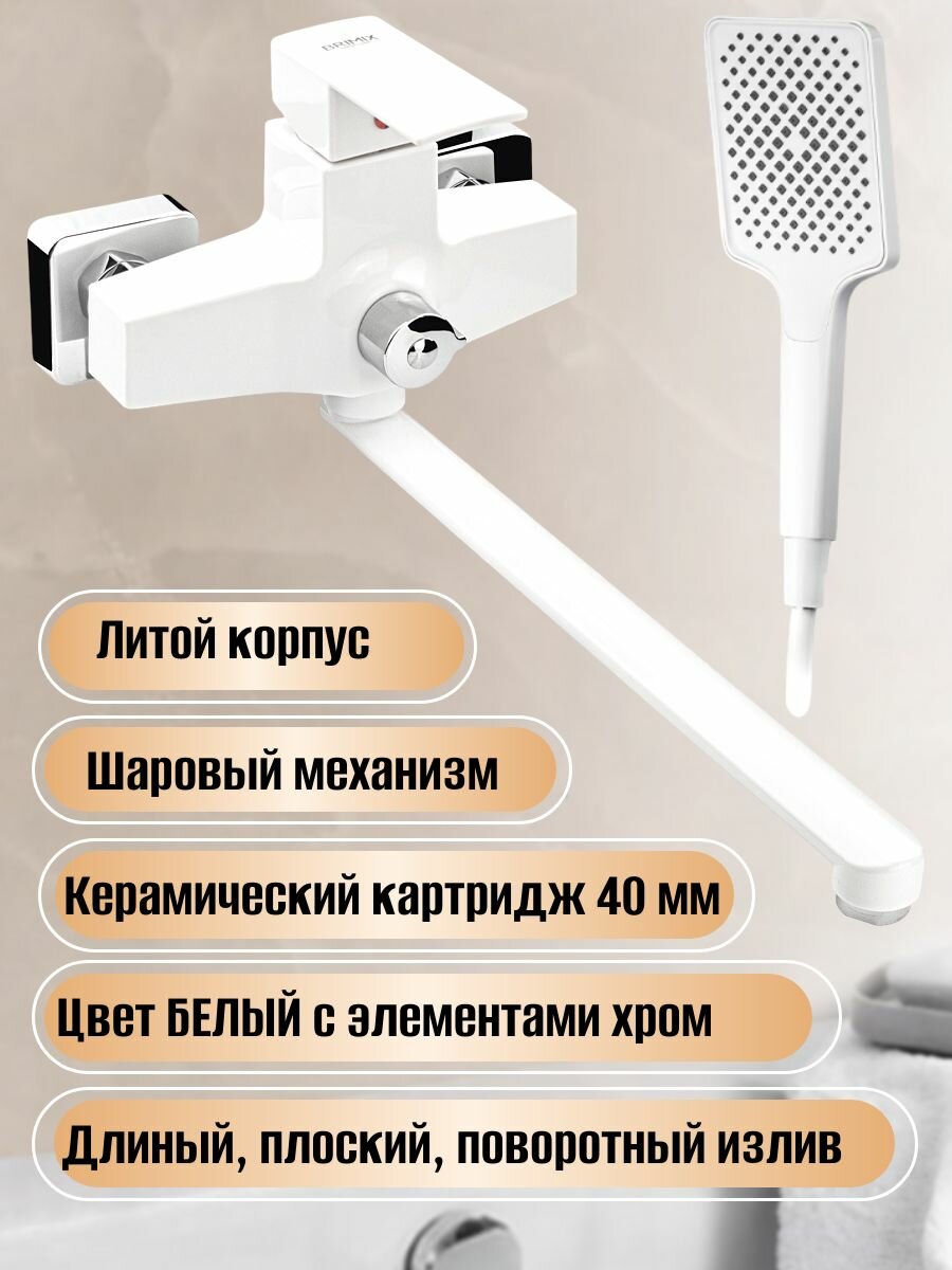 BRIMIX 5563 Смеситель в ванную, длинный излив, шаровый, из высокопрочного пластика АБС, белый, квадратный корпус