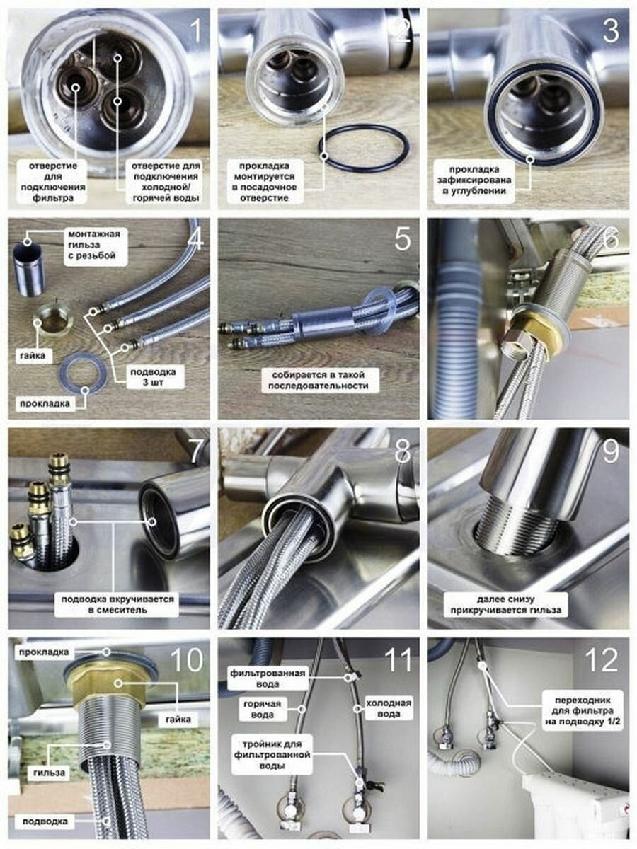 | Комплектация | Смеситель для кухни - 1 шт. Резиновое уплотнительное кольцо - 1 шт. Монтажная трубка полая - 1 шт. Резиновая прокладка - 1 шт. Металлическая затяжная гайка - 1 шт. Гибкая подводка 50 см под холодную и горячую воду - 2 шт. Гибкая подводка 50 см под фильтрованную воду - 1 шт. Переходник пластиковый под фильтр - 1 шт. Гарантийный талон и инструкция по эксплуатации - 1 шт. |