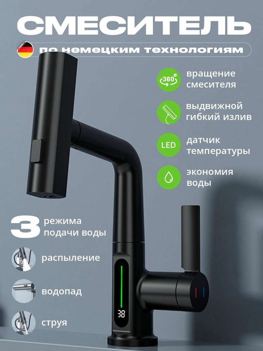 Смеситель для раковины с датчиком температуры и подсветкой, черный интересное: