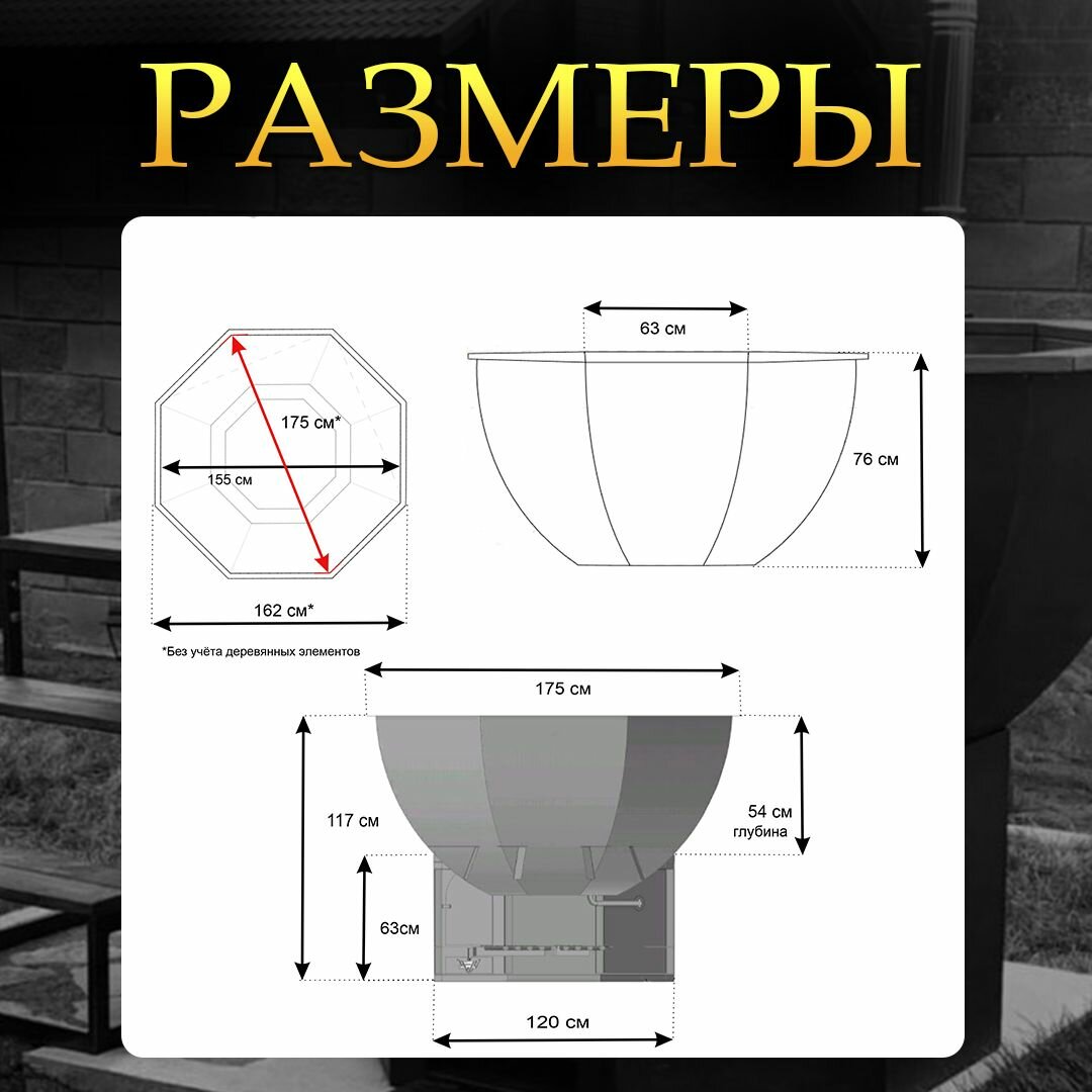 | Комплектация | Чан нержавеющая сталь Aisi 430 диаметр 200 см вместимость 4-6 человек с отделкой из лиственницы пол лавочки спинки и подлокотники подставка с ветрозащитой с дымоходом высотой 3 метра и защитным экраном приставная деревянная лестница из лиственницы с двумя поручнями |