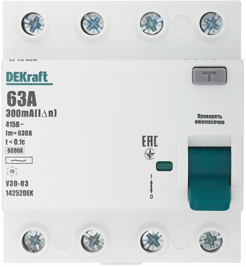 | Дополнительная информация | УЗО Dekraft 4P 63 A 30 мА 6 кА AC 14236DEK |