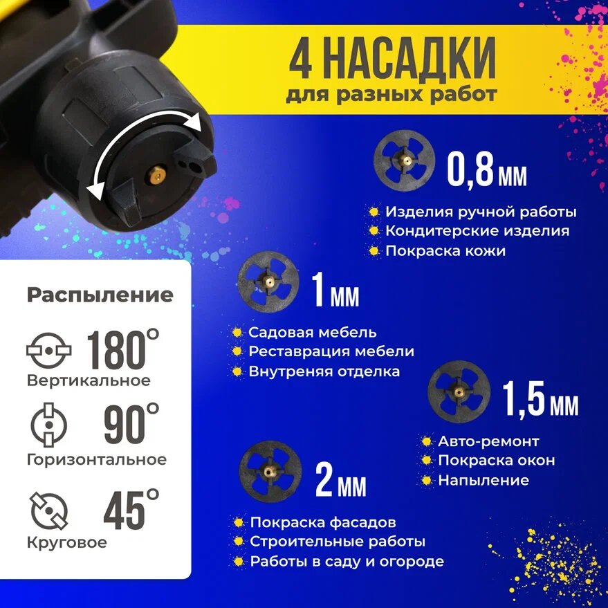 | Распыляемый материал | грунтовка / краска / лак / масло / протрава масляная / шпатлевка / эмаль |