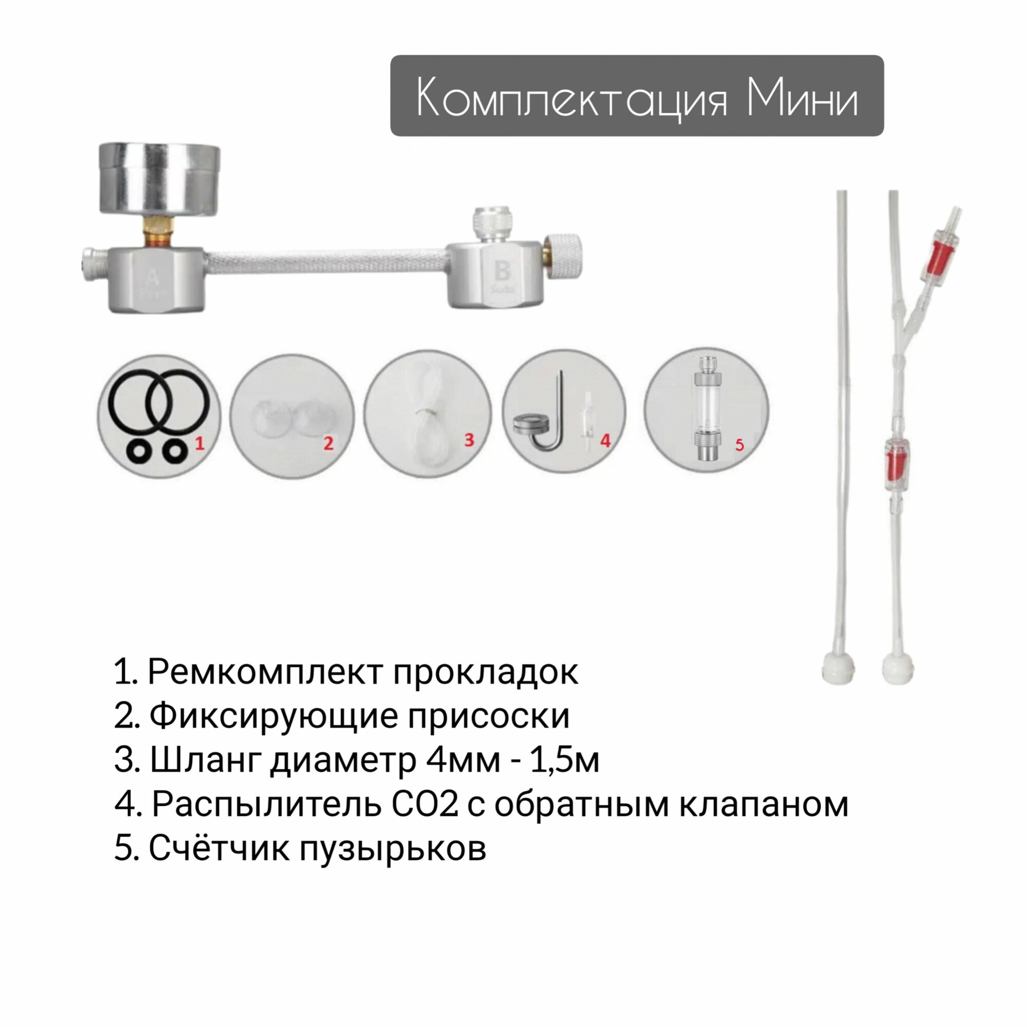 | Комплектация | 1. Установка для генерации СО2 - 1 шт 2. Счетчик пузырьков - 1 шт 3. Фиксирующие присоски - 2 шт 4. Шланг диаметром 4 мм - 1,5 м 5. Обратный клапан - 3 шт 6. Всасывающая головка - 2 шт 7. Тройник пластиковый - 1 шт 8. Распылитель СО2 - 1 шт 9. Запасной комплект уплотнительных прокладок колец - 1 шт |