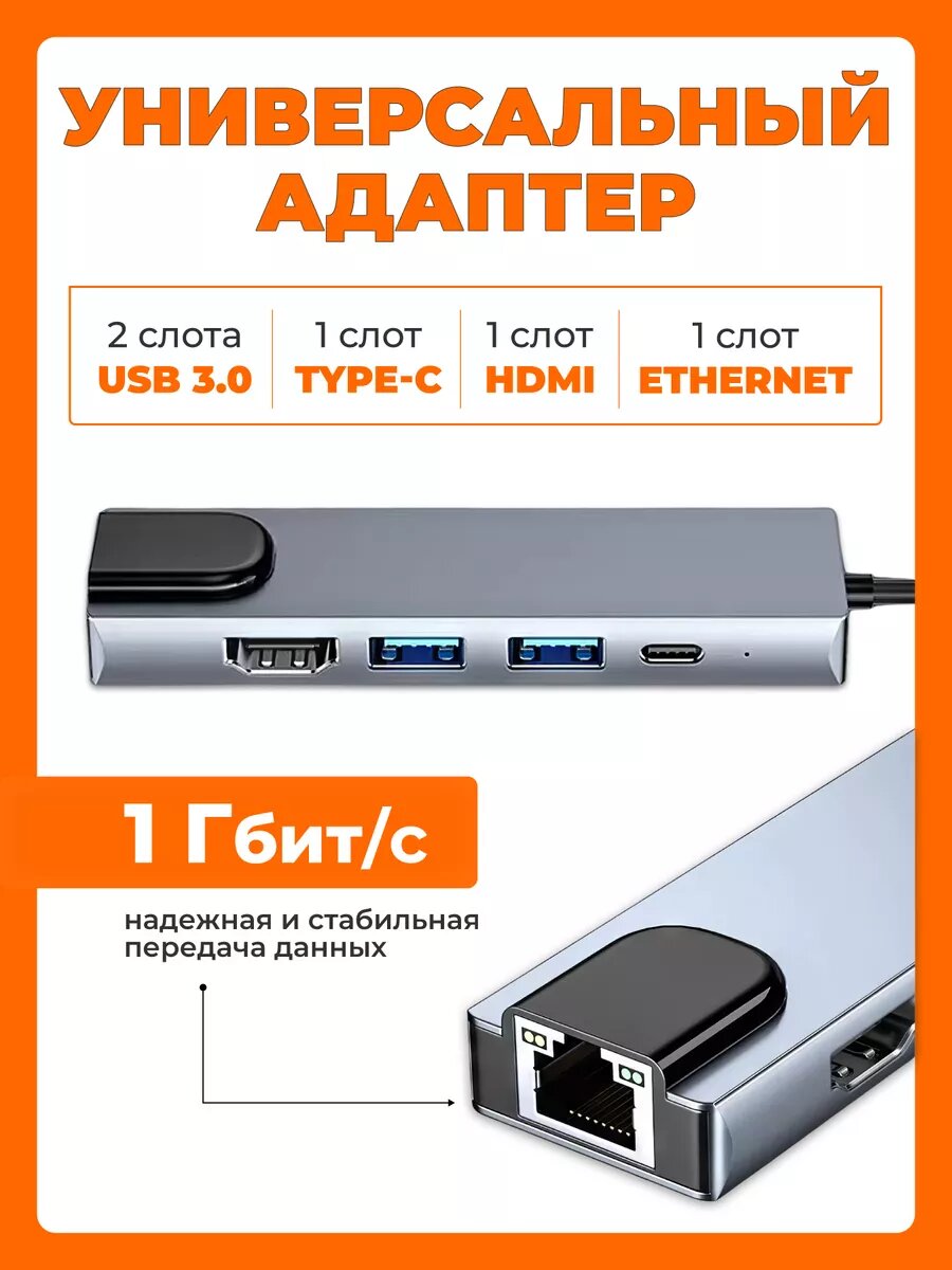 Купить USB Hub Концентратор 5 портов: USB, Type-C, HDMI, Ethernet
