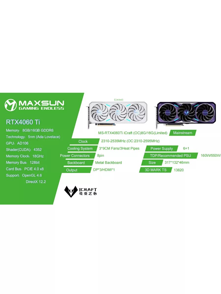 Купить Видеокарта Maxsun ICraft RTX4060Ti OC 8GB GDDR6 256-bit DPx3 HDMI 3FAN RTL