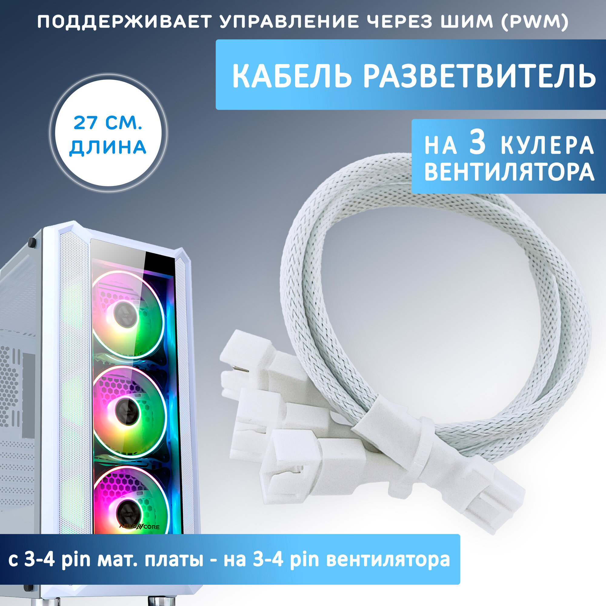Кабель разветвитель на 3 кулера/вентилятора на 3-4 pin. PWM, 27см белый в оплетке, удлинитель вентилятора интересное: