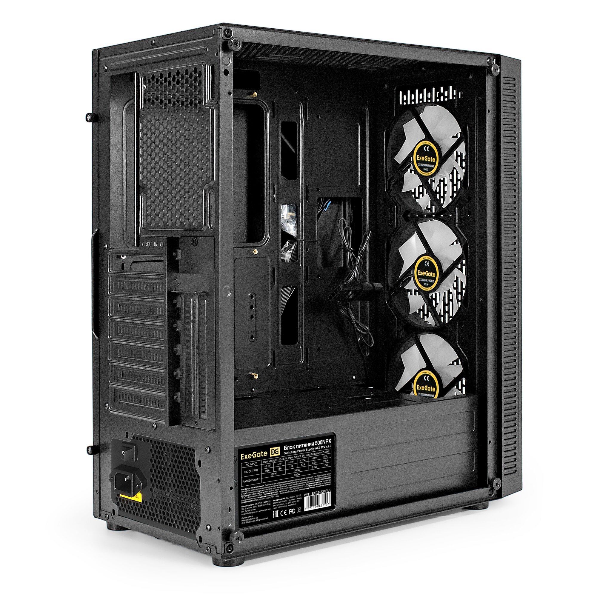 Купить Корпус Miditower ExeGate EVO-5001A-500NPX (ATX, БП 500NPX с вент. 12 см, 2*USB+1*USB3.0+HD Audio, черный, 3 вент.12см с RGB подсветкой, боковая панель - закаленное стекло) EX296317RUS