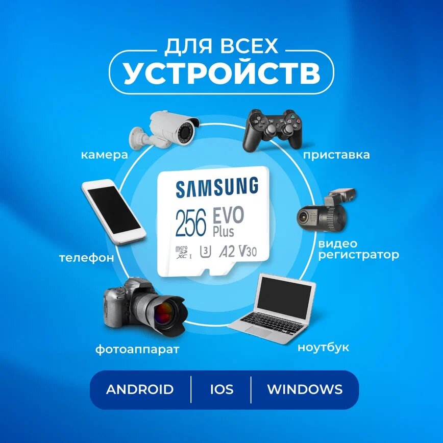 Карта памяти microSD 256ГБ Samsung Class 10 Evo Plus V30 UHS-I U3