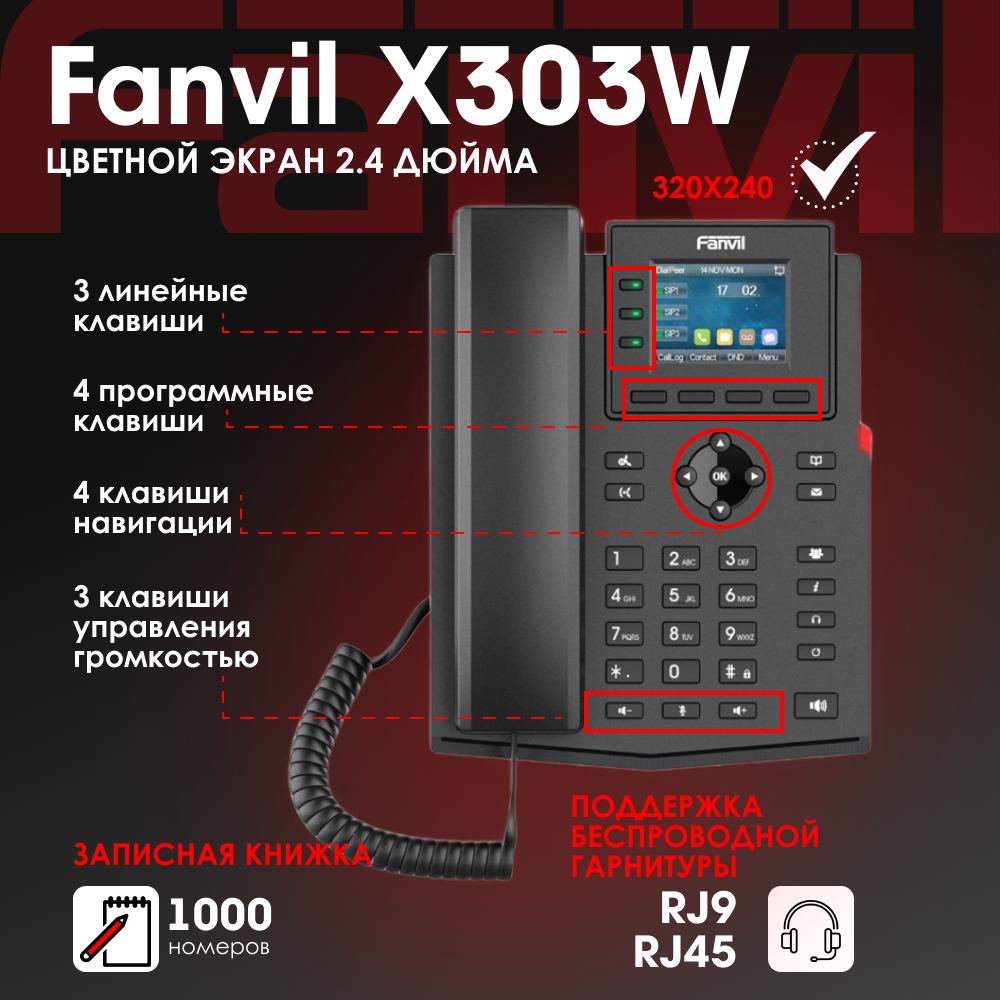 IP-телефон Fanvil X303W, 4 SIP аккаунта, цветной 2,4 дюйма дисплей 320x240, конференция на 6 абонентов, поддержка EHS,Wi-Fi, POE. интересное: