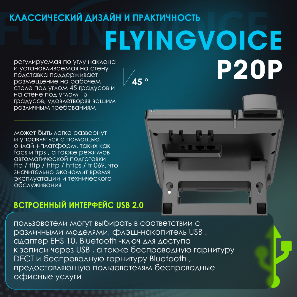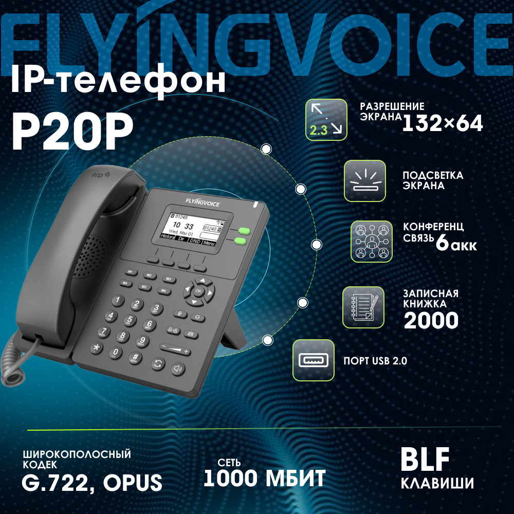 IP-телефон FLYINGVOICE P20P, 2 SIP аккаунта, монохромный дисплей 2,3 дюйма, 132 x 64 с подсветкой, конференция на 6 абонентов, (RJ9)/DECT, USB и Wi-Fi интересное: