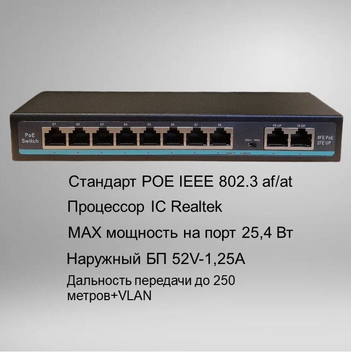 Коммутатор YDA POE(свитч) 8POE+2Uplink,100 Мбит/с, WatchDog+VLAN, Бюджет 120 Ватт,наружный БП, switch IC REALTEK интересное:
