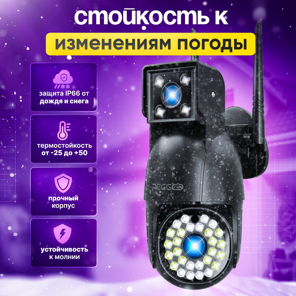 Камера видеонаблюдения уличная Wi-Fi с двумя объективами Black / REGGO/ Поворотная двойная IP видеокамера с датчиком движения и сигнализацией 4x4МП интересное:
