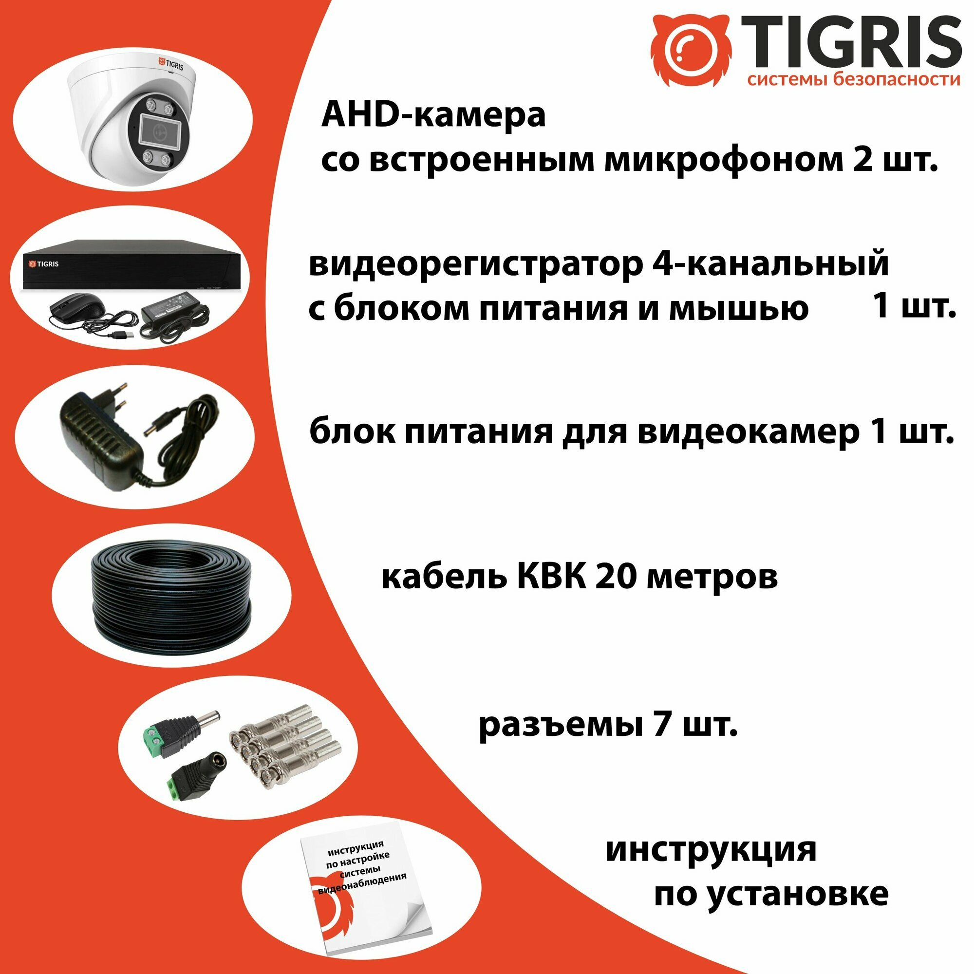 | Подробная комплектация | В комплект входит: 1. Видеорегистратор профессиональный, 4-канальный (блок питания и мышь для управления в комплекте) - 1 шт. 2. Видеокамера внутренняя FULL HD с микрофоном - 1 шт. 3. Блок питания для видеокамер - 1 шт. 4. Кабель уличный, комбинированный (питание+видеосигнал) - 10 метров. 5. Комплект разъемов для подключения системы - 1 шт. 6. Инструкция по подключению системы - 1 шт. |