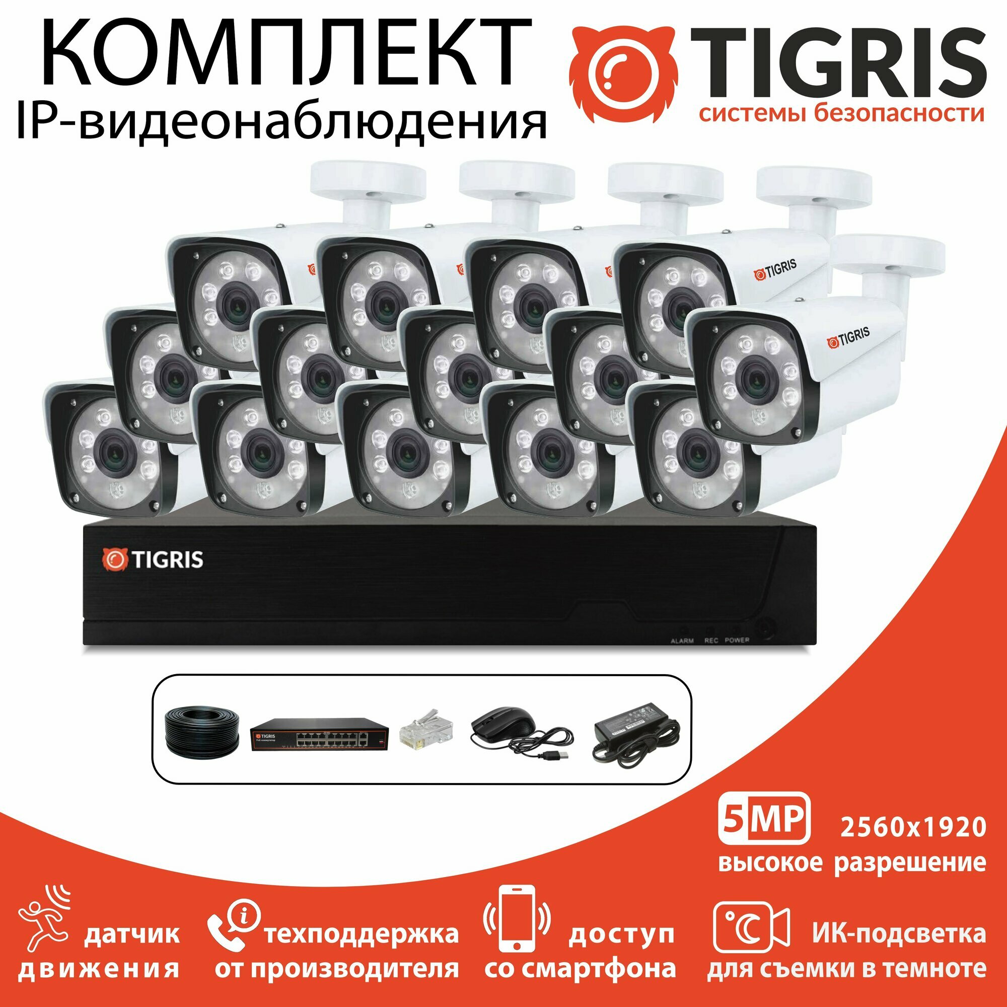 Готовый комплект IP-видеонаблюдения 5 мегапикселей на 12 уличных камер