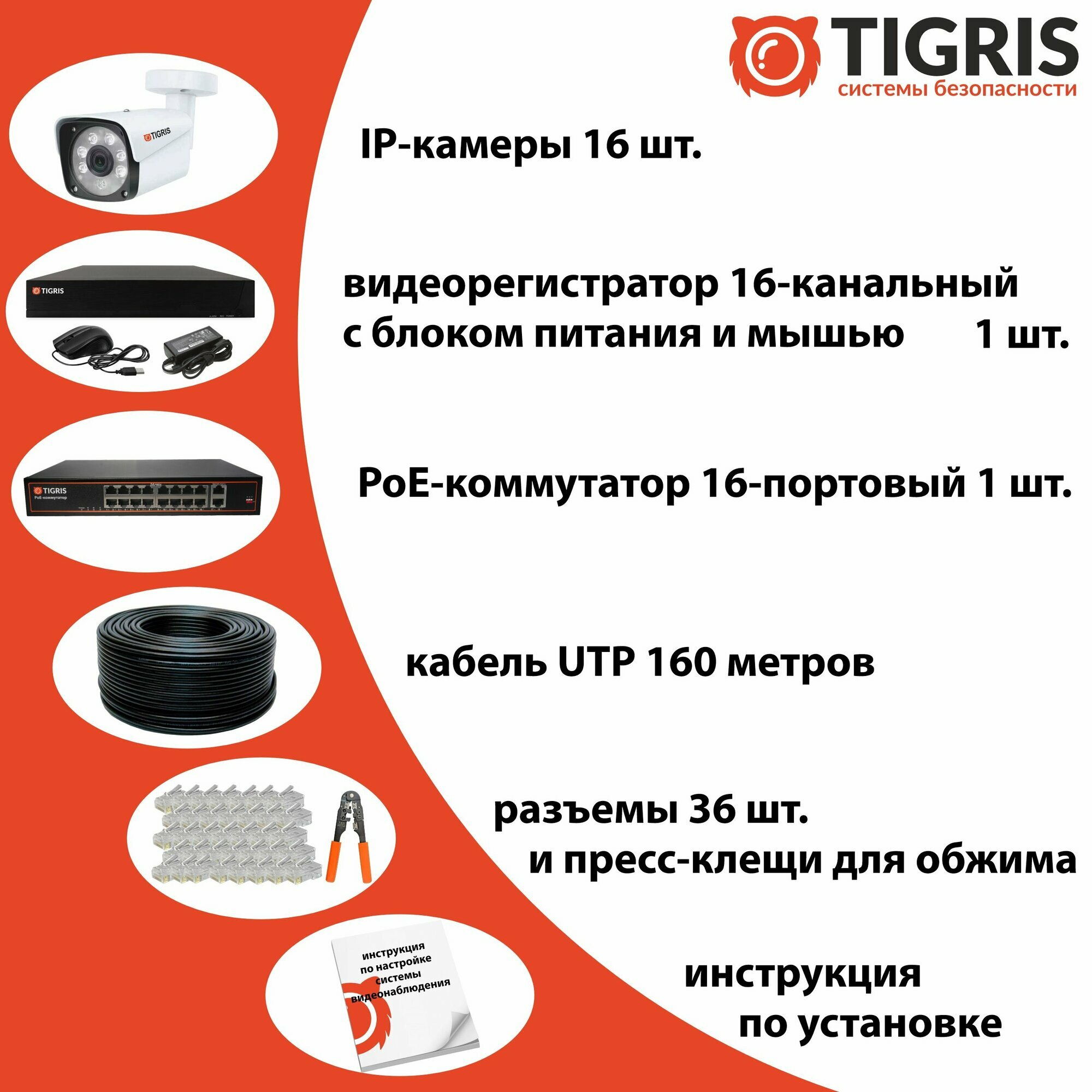 | Подробная комплектация | В комплект входит: 1. Видеорегистратор профессиональный, 16-канальный (блок питания и мышь для управления в комплекте) - 1 шт. 2. PoE-коммутатор 16-портовый. 3. Видеокамера уличная с микрофоном 5 мегапикселей - 16 шт. 4. Кабель UTP, уличный (4 пары) - 160 метров. 5. Комплект разъемов для подключения системы - 1 шт. 6. Инструкция по подключению системы - 1 шт. |