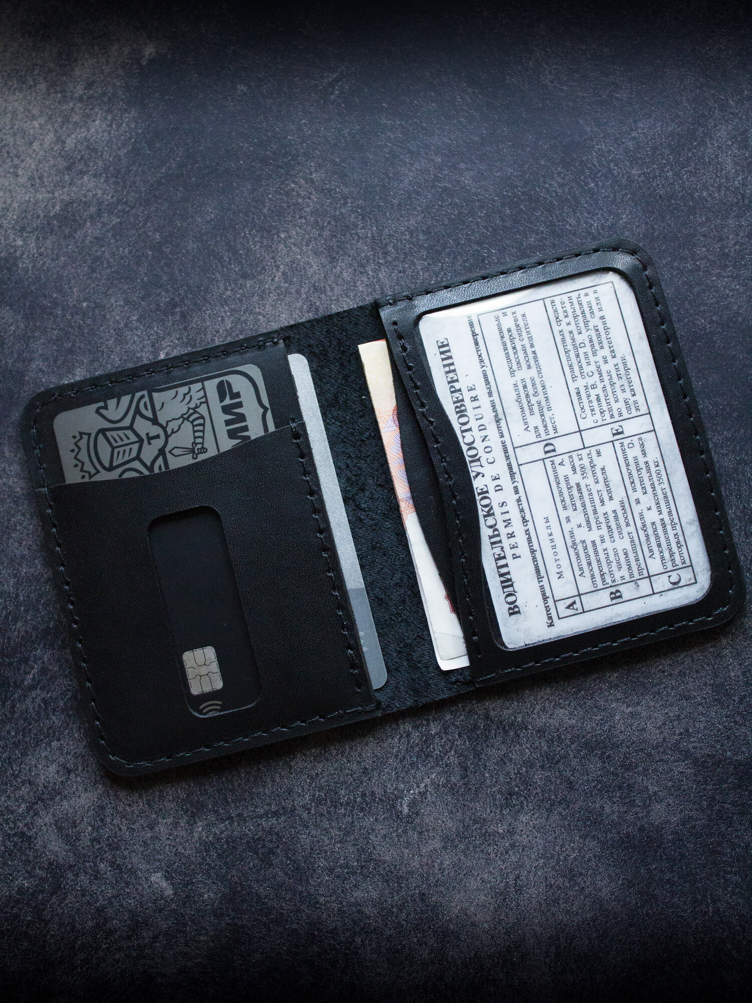 Картхолдер-книжка с окошком для прав, карт, наличных KOVACH из натуральной кожи чёрного цвета с черной строчкой ручной работы интересное: