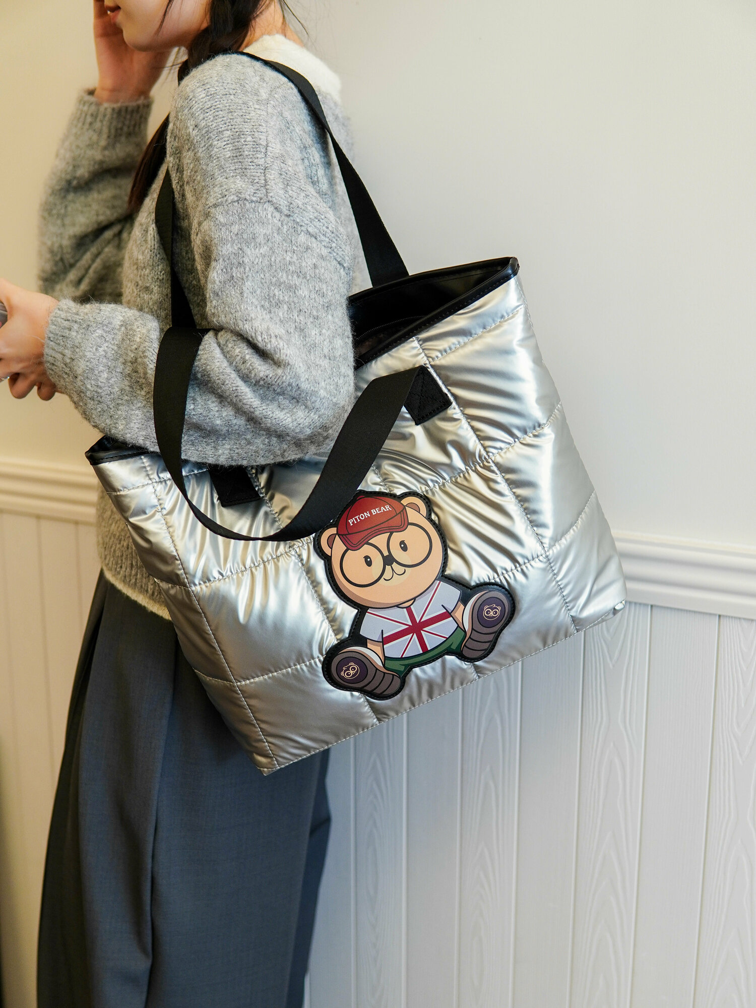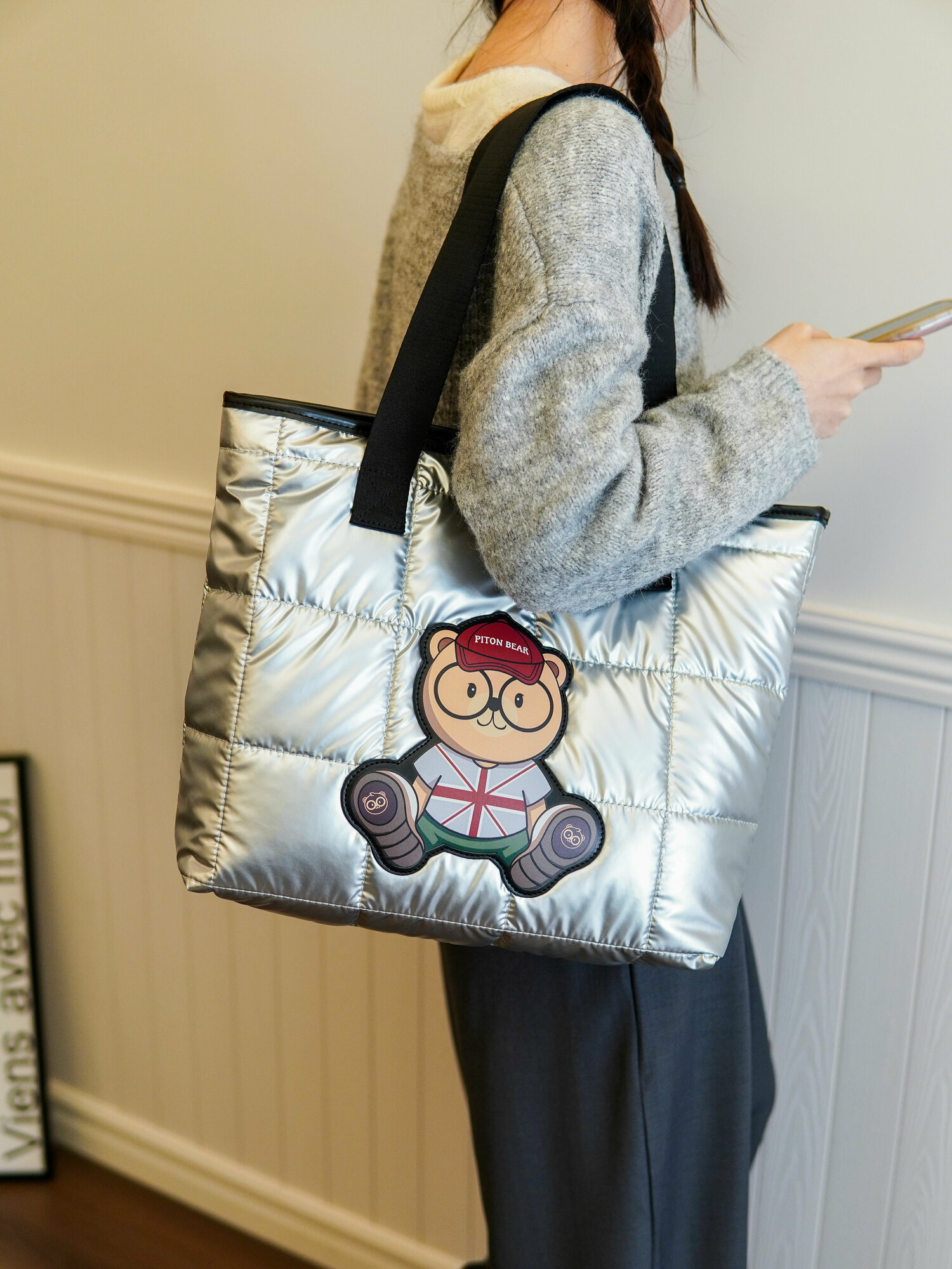 Сумка шоппер Beibaobao дутая, размер XL, серебро интересное: