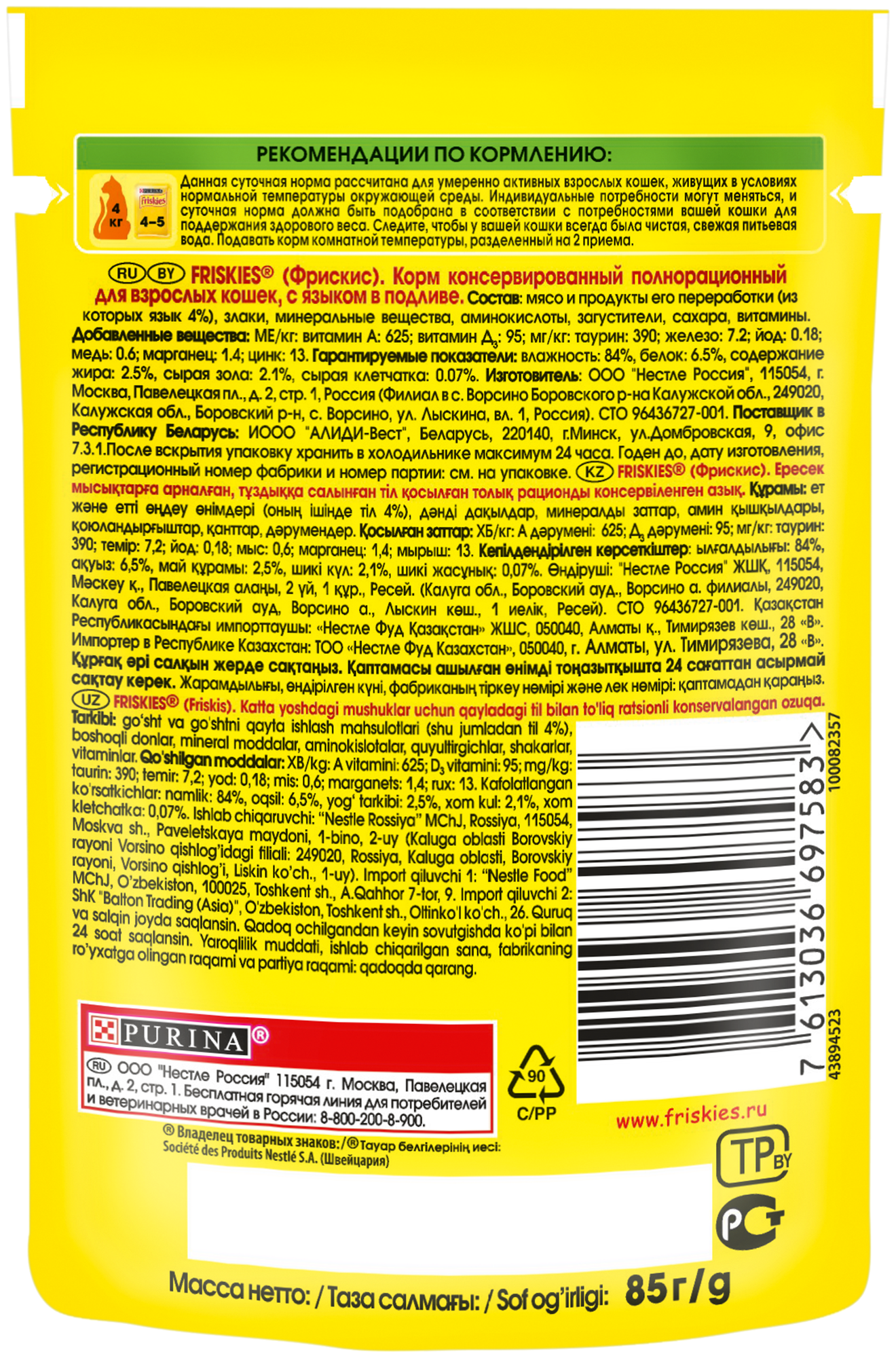 Купить Friskies ВВА Паучи Кусочки в подливе c Языком для кошек 123830651247876812494290 0,085 кг 36476 (2 шт)