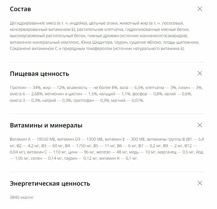 | Минусы: | Очень высокая цена,плохая упаковка(стоит вскрыть пакет,он раскрывается по всему шву),нет магнитной застежки.Покупаем пакеты по 10 кг,расход не быстрый,качество корма быстро ухудшается.Об этих недостатках покупатели пишут годами,но производитель игнорирует отзывы.Если найдем подходящий по качеству аналог-перейдем к другому производителю. |