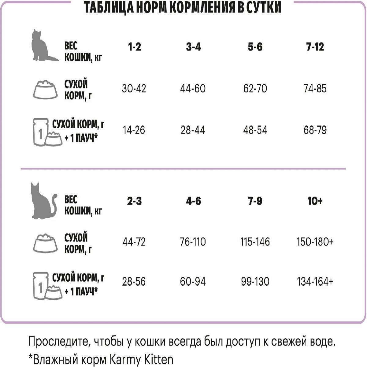 | Отзыв: | Посоветовали друзья. Расход меньше - насыщается котёнок надолго. Кормим согласно норме на упаковке. |