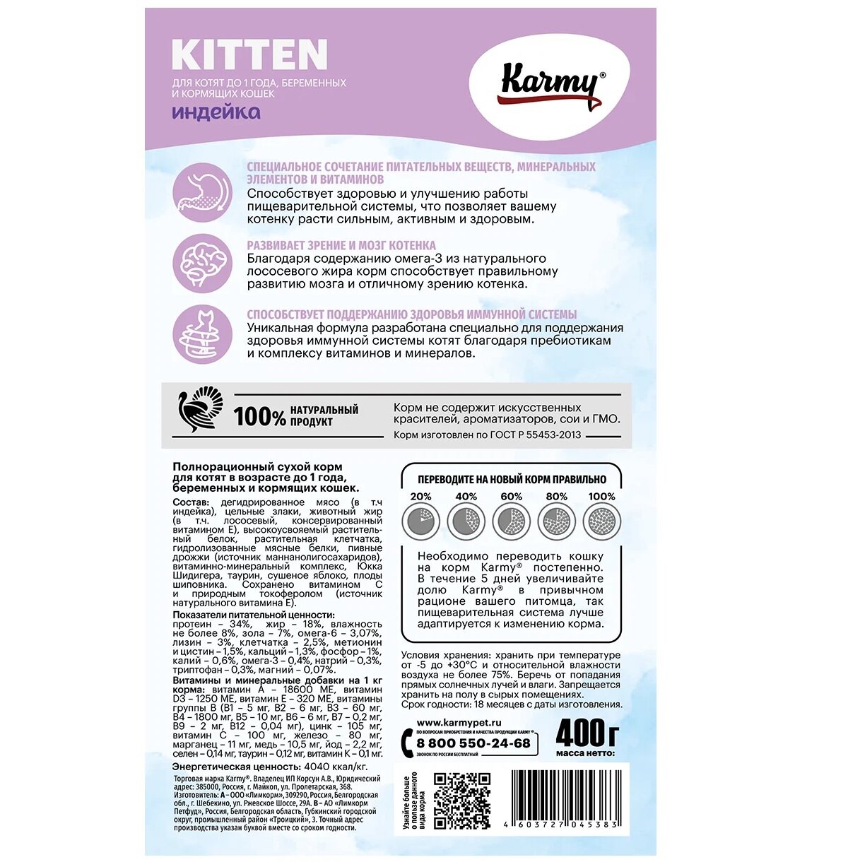 Karmy Kitten корм для котят с индейкой 400 г