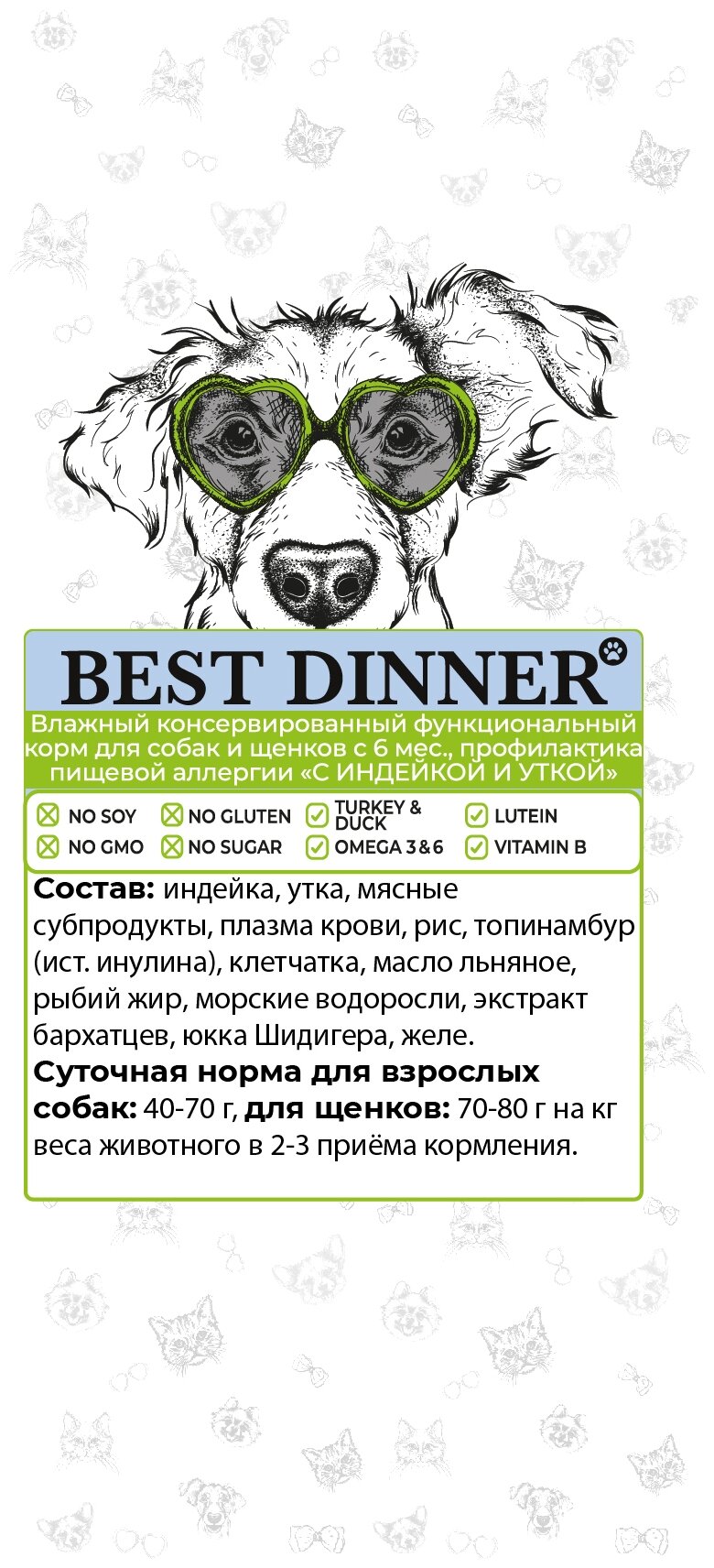 Влажный консервированный корм Best Dinner Бест Диннер для собак Exclusive Hypoallergenic, индейка, утка, 340 гр. по 12 шт.