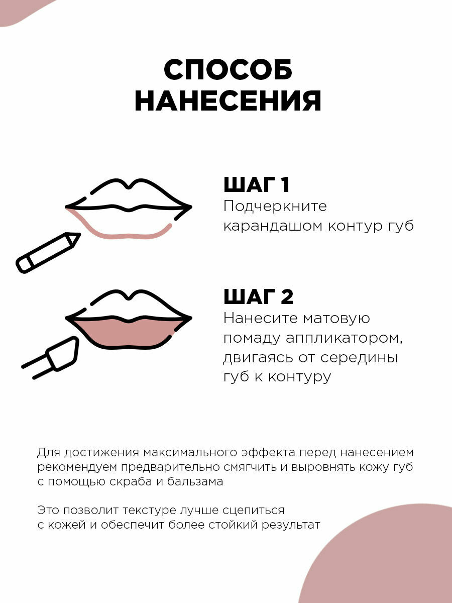 | Способ применения | очертите контур губ и растушуйте линию внутрь, чтобы мягко соединить с помадой или блеском. Или накрасьте карандашом всю поверхность губ |