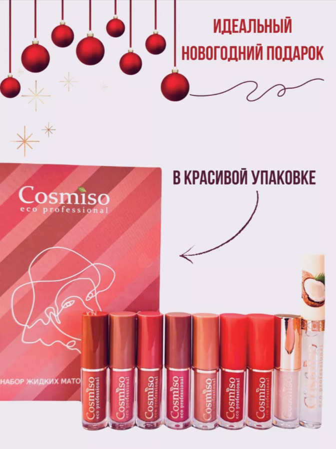 | Подробная комплектация | 8 матовых стойких помад и 1 блеск + питательное масло для губ с запахом кокоса |