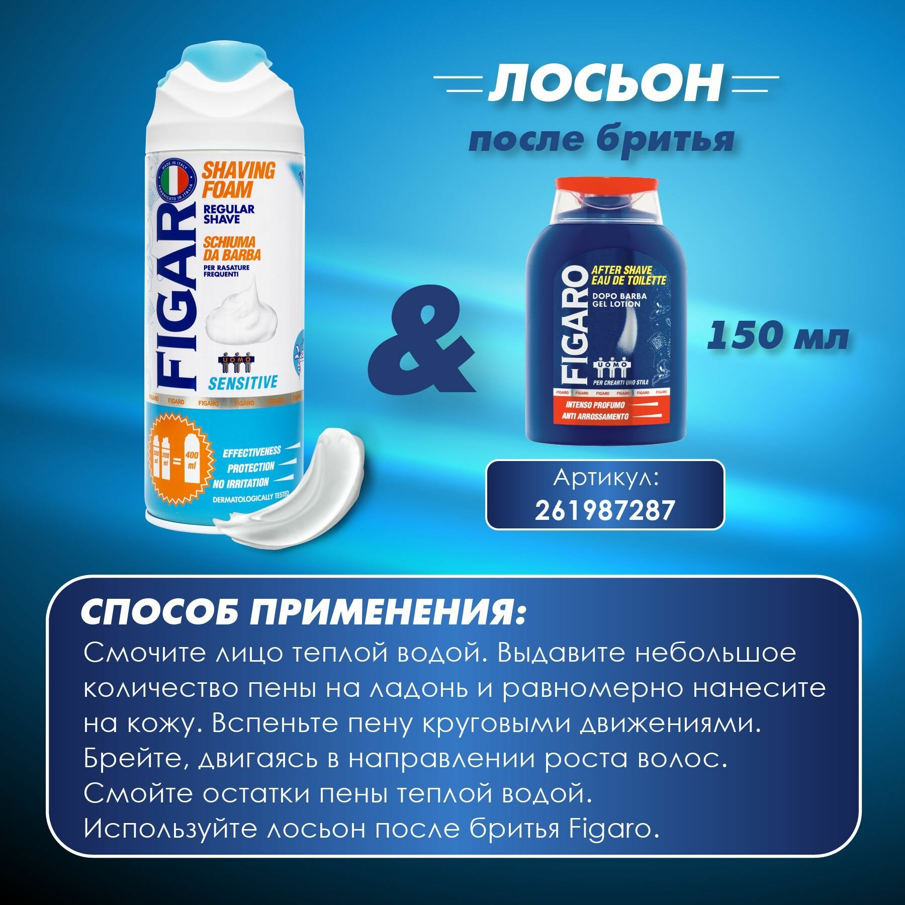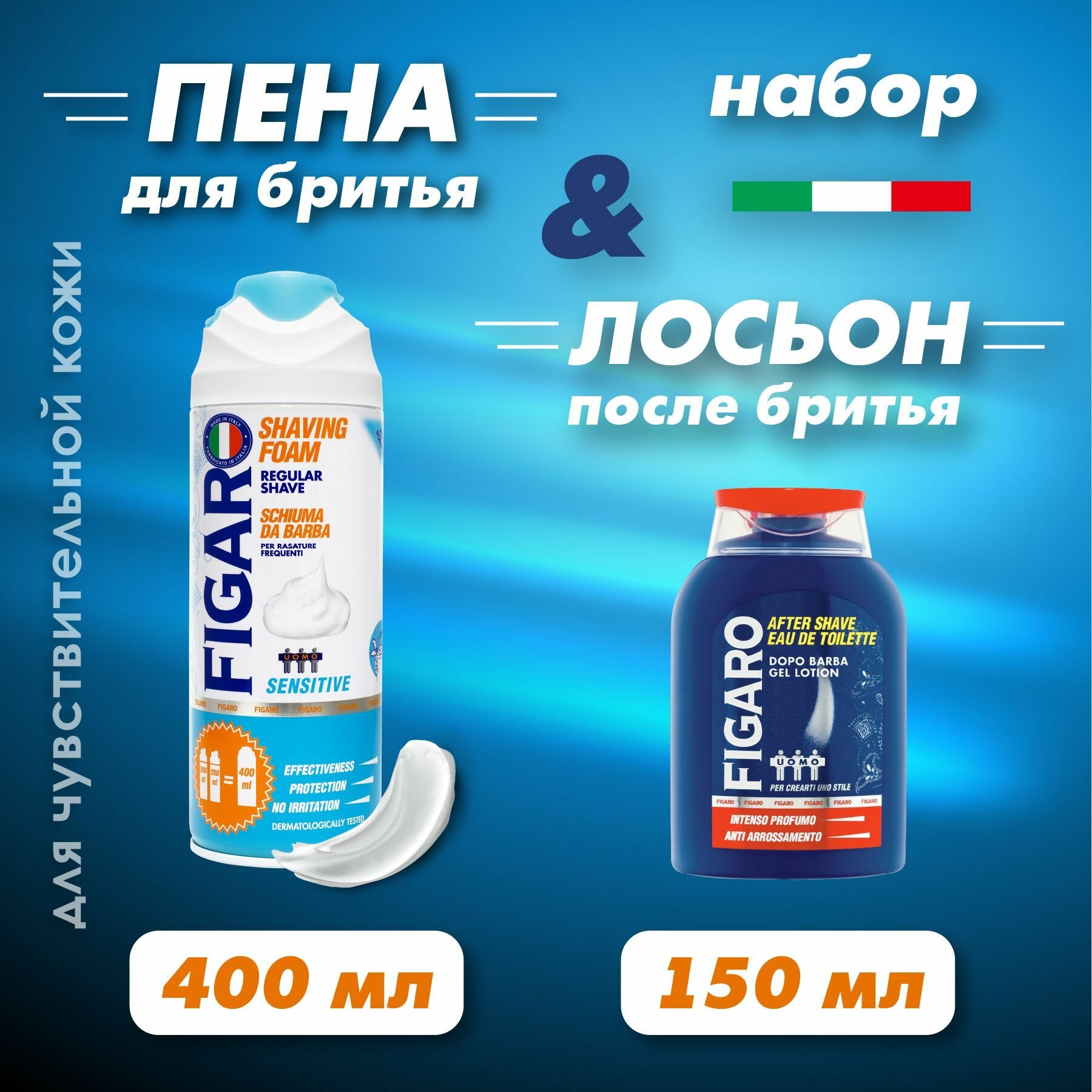 | Комплектация | Гель-лосьон после бритья FIGARO 150мл; пена для бритья для чувствительной кожи FIGARO Sensitive 400мл. |