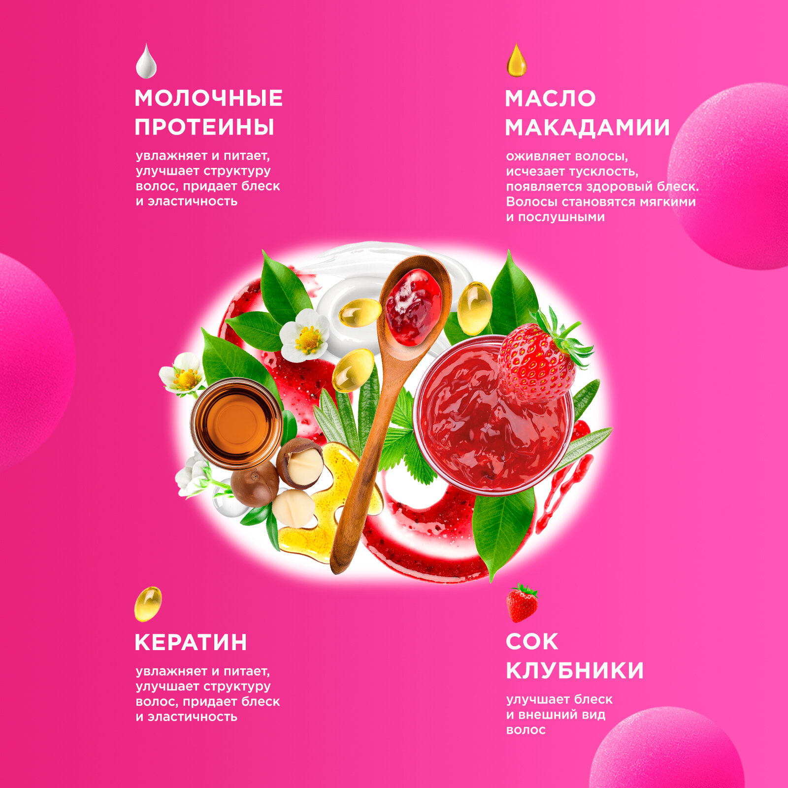 | Состав | Шампунь: Hydrolyzed milk protein (Гидролизованный молочный белок) / Fragaria vesca (strawberry) fruit extract (Экстракт плодов клубники) / Hydrolyzed keratin (Гидролизованный кератин) / Phenoxyethanol (Феноксиэтанол) / Citric Acid (Кислота лимонная) / salt EDTA (Динатрий ЭДТА) / Fragrance (Отдушка) / Sodium Chloride (Хлорид натрия) / Polyquaternium-7 (Поликватерниум-7) / PEG-7 Glyceril Cocoat (Глицерилкокоат) / Cocamide DEA (Кокамид ДЭА) / Cocamidopropyl Betaine (Кокамидопропилбетаин) / Sodium Laureth Sulfate (Лаурил Сульфат Натрия) / Aqua (Вода) / dye (краситель). Бальзам: Fragaria vesca (strawberry) fruit extract (Экстракт плодов клубники) / D-Panthenol (Д-пантенол) / Hydrolized keratin (Гидролизованный кератин) / Tocopheryl Acetate (Токоферола ацетат) / Phenoxyethanol (Феноксиэтанол) / Fragrance (Отдушка) / Amodimethicone (Силиконы) / Dicocoylethyl Hydroxyethylmonium Methosulfate (Метосульфат дикокоилэтилгидроксиэтилмония) / Caprylic/Capric Triglyceride (Каприловый/каприновый триглицерид) / Polyquaternium-7 (Поликватерниум-7) / Propylene Glycol (Пропиленгликоль) / Cetrimonium Chloride (Цетримониум хлорид) / Cetearyl Alcohol (Цетеариловый спирт) / aqua (вода). Маска: Hydrolized milk protein (Гидролизованный молочный белок) / Fragaria vesca (strawberry) fruit extract (Экстракт плодов клубники) / D-Panthenol (Д-пантенол) / Hydrolized keratin (Гидролизованный кератин) / Tocopheryl Acetate (Токоферола ацетат) / Phenoxyethanol (Феноксиэтанол) / Fragrance (Отдушка) / Amodimethicone (Силиконы) / Dicocoylethyl Hydroxyethylmonium Methosulfate (Метосульфат дикокоилэтилгидроксиэтилмония) / Caprylic/Capric Triglyceride (Каприловый/каприновый триглицерид) / Polyquaternium-7 (Поликватерниум-7) / Propylene Glycol (Пропиленгликоль) / Cetrimonium Chloride (Цетримониум хлорид) / Cetearyl Alcohol (Цетеариловый спирт) / aqua (вода). |