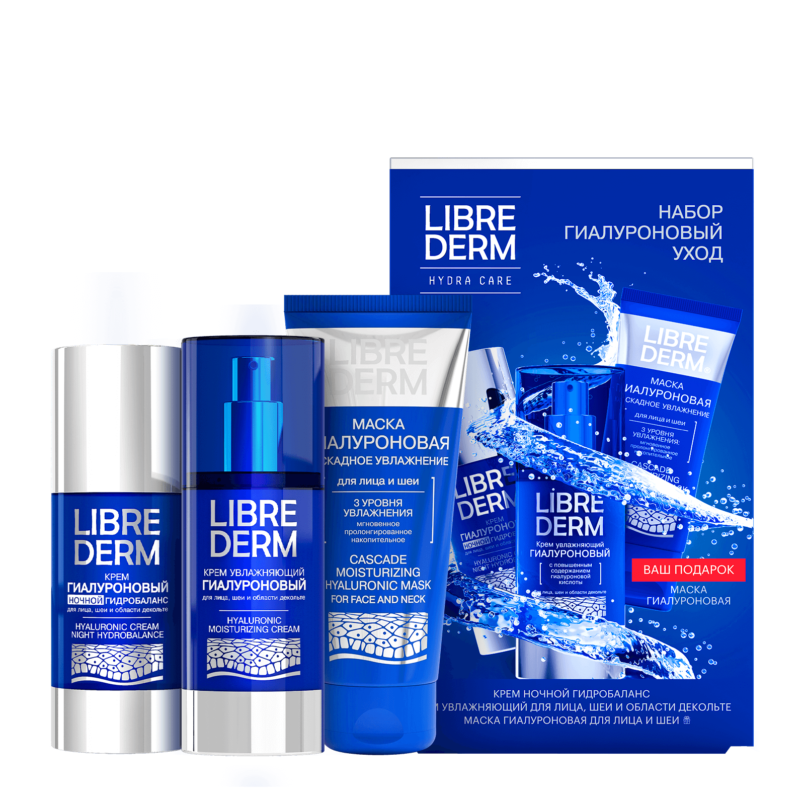| В наборе | гиалуроновый увлажняющий крем для лица, шеи и области декольте 50 мл, гиалуроновый крем "Ночной гидробаланс" 50 мл, маска гиалуроновая "Каскадное увлажнение" 75 мл |