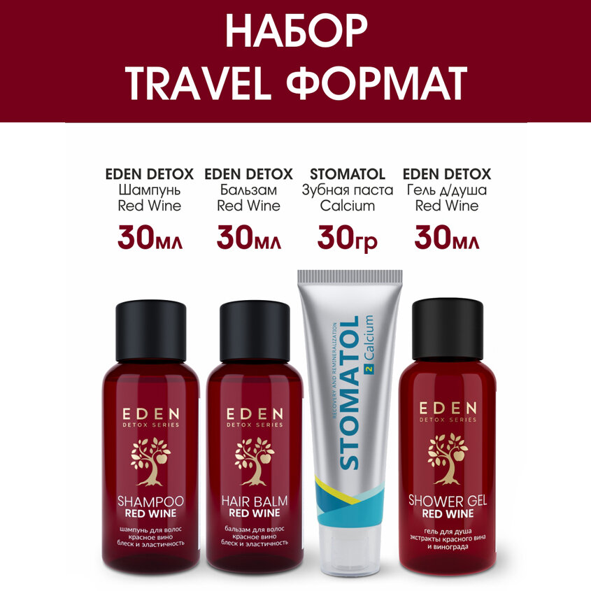 Набор дорожный EDEN DETOX TRAVEL Шампунь 30 мл, бальзам 30 мл, гель для душа 30 мл, зубная паста STOMATOL Calcium 30 мл интересное:
