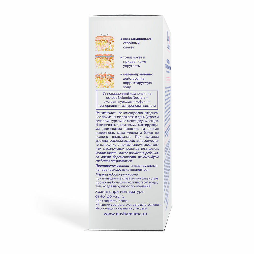 | Способ применения | рекомендовано ежедневное применение два раза в день (утром и вечером) курсом не менее двух месяцев; интенсивными, круговыми, массирующими движениями наносить на чистую поверхность кожи живота и боков до полного впитывания; при желании усиления эффекта воздействия, совместите нанесение с применением специальных массирующих роликов или щеток |