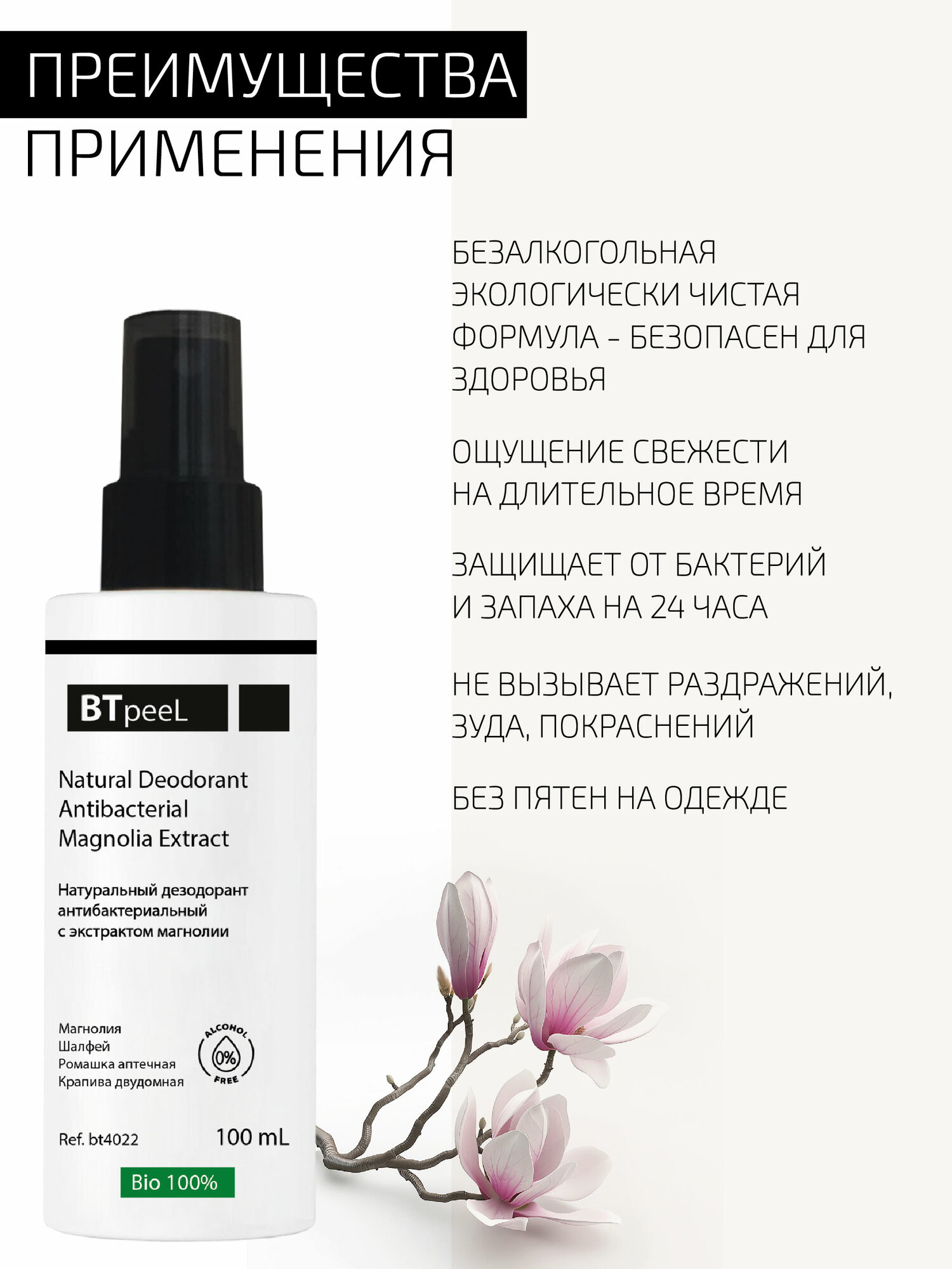 Дезодорант натуральный антибактериальный с экстрактом магнолии BTpeel, 100 мл интересное: