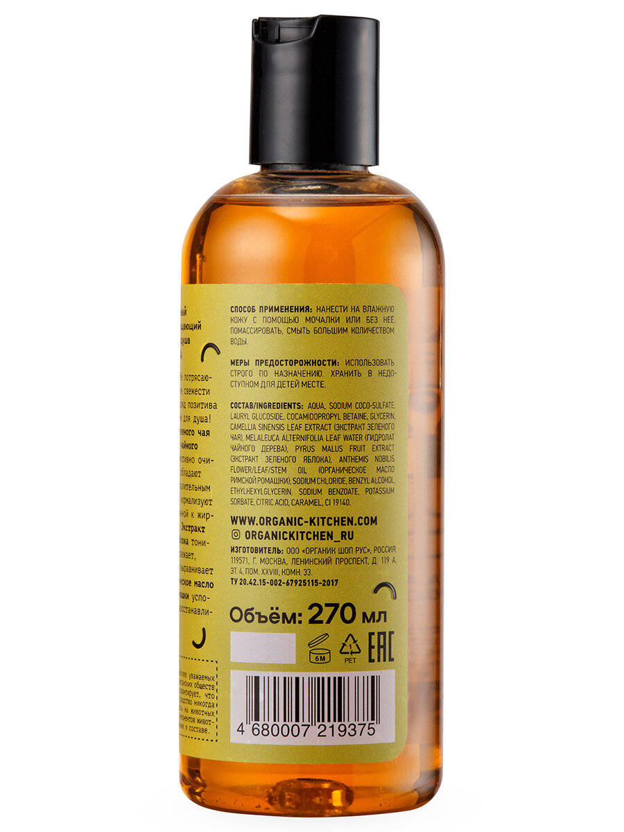 | Состав | Aqua,Sodium Coco-Sulfate,Lauryl Glucoside,Cocamidopropyl Betaine,Glycerin,Camellia Sinensis Leaf Extract (экстракт зеленого чая),Melaleuca Alternifolia Leaf Water (гидролат чайного дерева),Pyrus Malus Fruit Extract (экстракт зеленого яблока),Anthemis Nobilis Flower/Leaf/Stem Oil (органическое масло римской ромашки),Sodium Chloride,Benzyl Alcohol,Ethylhexylglycerin,Sodium Benzoate,Potassium Sorbate,Citric Acid,Parfum,Caramel,CI 19140. |