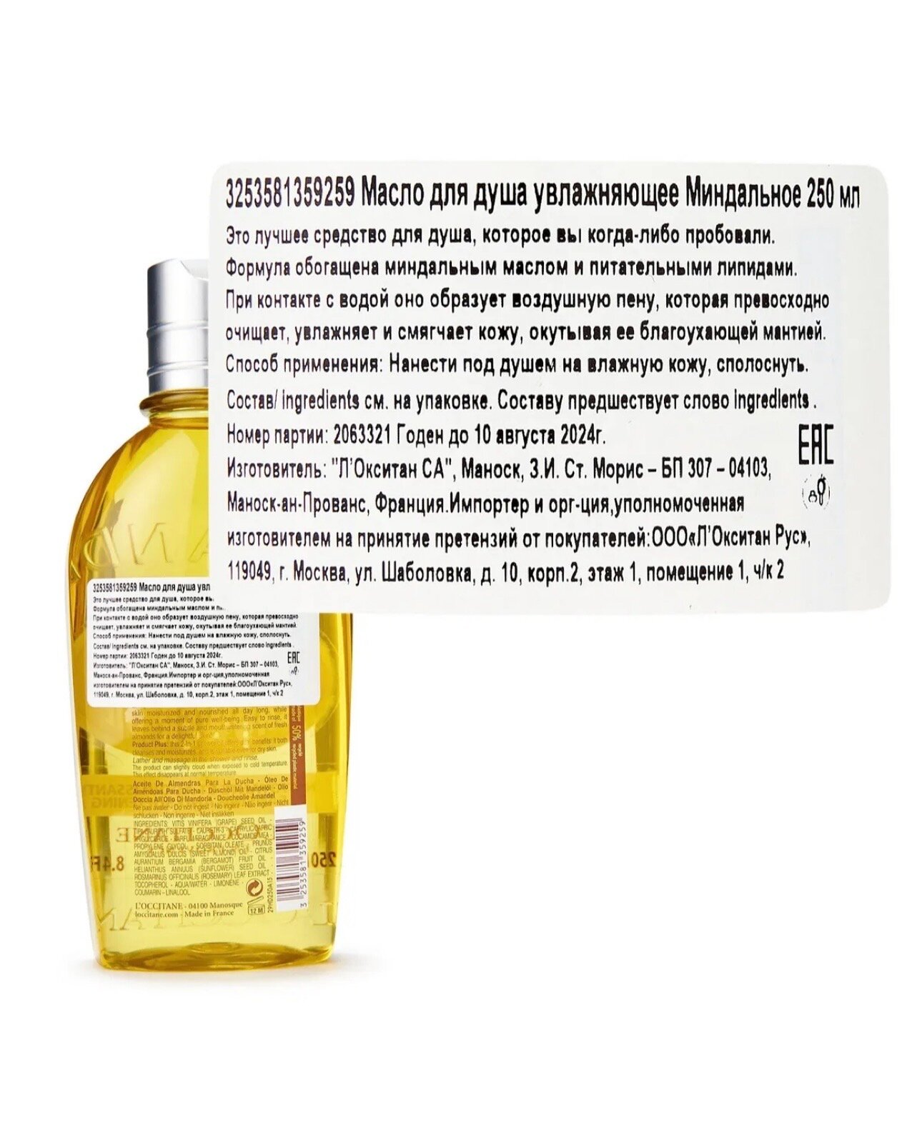 Масло для душа L'Occitane en Provence Almond, 250 мл интересное: