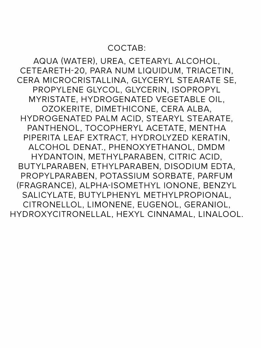 | Состав | Aqua (Water), Urea, Cetearyl Alcohol, Ceteareth-20, Para num Liquidum, Triacetin, Cera Microcristallina, Glyceryl Stearate SE, Propylene Glycol, Glycerin, Isopropyl Myristate, Hydrogenated Vegetable Oil, Ozokerite, Dimethicone, Cera Alba, Hydrogenated Palm Acid, Stearyl Stearate, Panthenol, Tocopheryl Acetate, Mentha Piperita Leaf Extract, Hydrolyzed Keratin, Alcohol Denat., Phenoxyethanol, DMDM Hydantoin, Methylparaben, Citric Acid, Butylparaben, Ethylparaben, Disodium EDTA, Propylparaben, Potassium Sorbate, Parfum (Fragrance), Alpha-Isomethyl Ionone, Benzyl Salicylate, Butylphenyl Methylpropional, Citronellol, Limonene, Eugenol, Geraniol, Hydroxycitronellal, Hexyl Cinnamal, Linalool. |