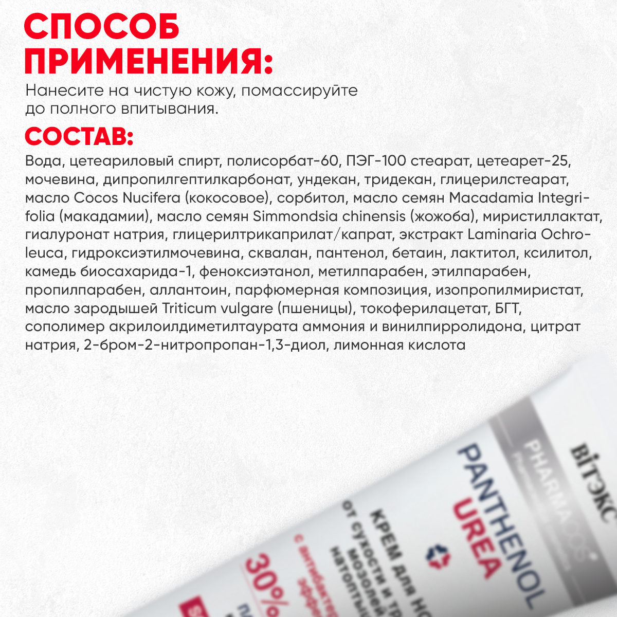| Активный ингредиент | D-пантенол / аллантоин / витамины / воск пчелиный / глицерин / жирные кислоты / ланолин / лецитин / минералы Мертвого моря / мочевина / пантенол (провитамин B5) / парафин / сорбитол / спирт |