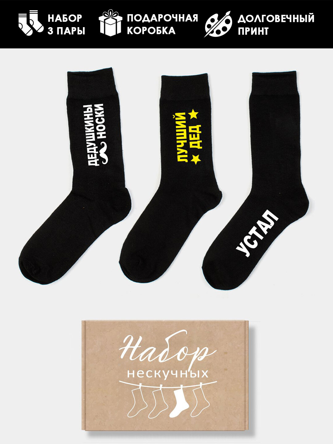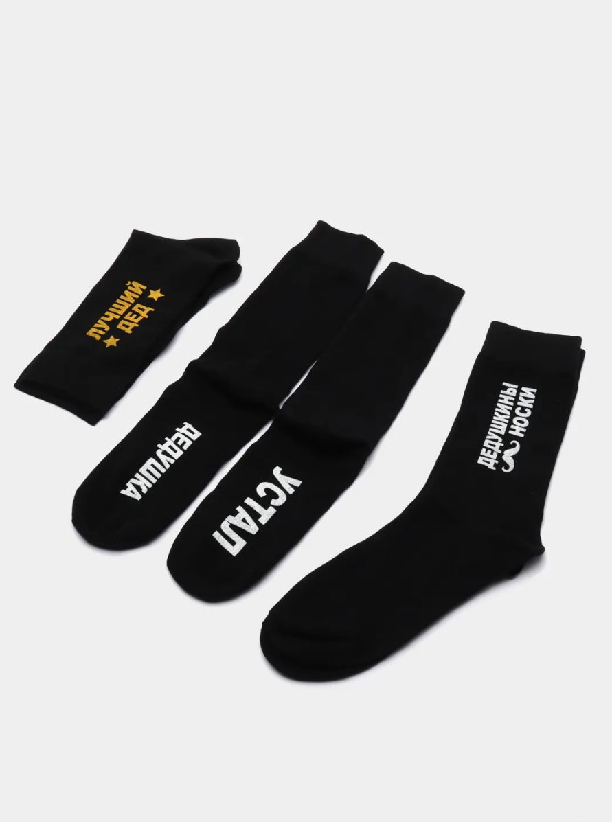 Ниже Вы можете прочитать отзывы на Подарочный набор 3 пары мужских носков с принтом Дедушке, ознакомится с подробными характеристиками, посмотреть интересные обзоры и фотографии на Подарочный набор 3 пары мужских носков с принтом Дедушке.