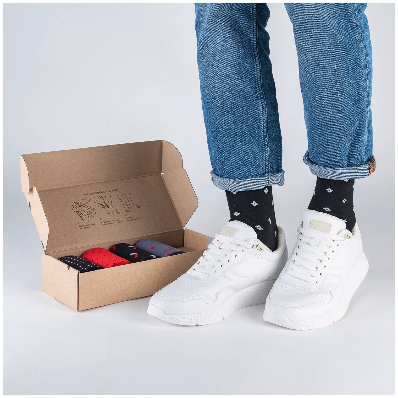 НС-5-220 Набор из 5 пар мужских носков "Нева-Сокс" белые черные красные горох полоска принт рисунок средние высокие длинные хлопок хб хлопковые разноцветные комплект упаковка микс снегири прилетели