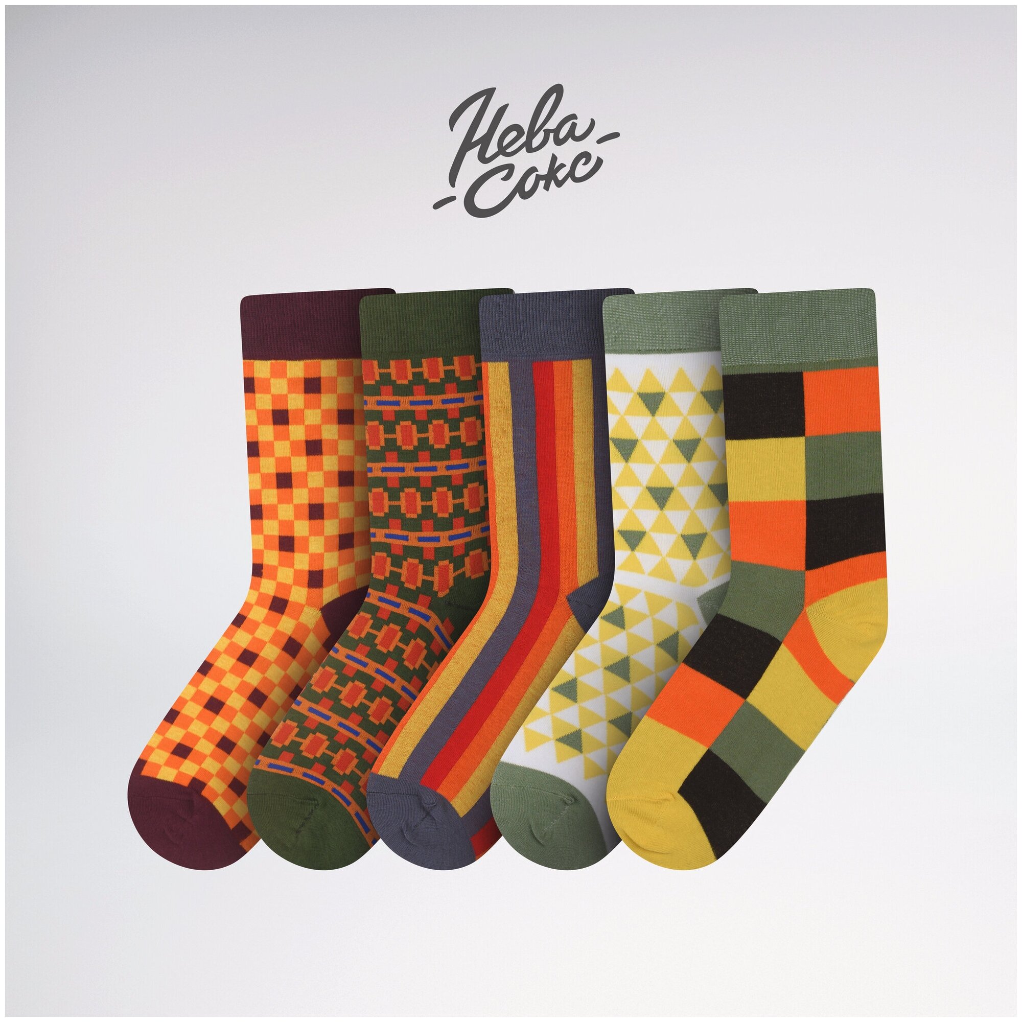 НС-5-210 Набор из 5 пар мужских носков "Нева-Сокс" желтые оранжевые клетка полоска ромб принт рисунок яркие цветные разноцветные повседневные длинные высокие средние хлопок хб хлопковые коробка комплект подарок
