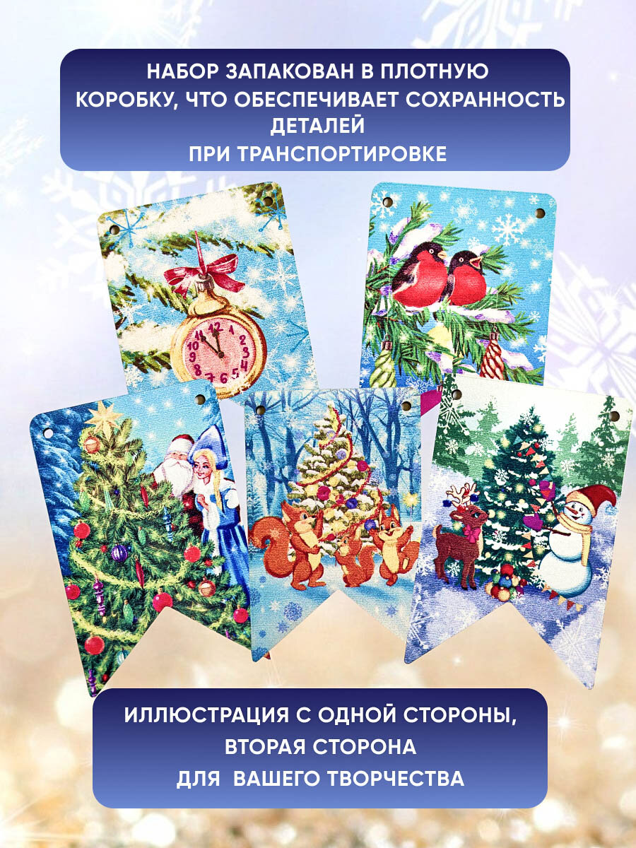 | Комплектация | комплект новогодних флажков на елку - 10 шт, джутовая нить |