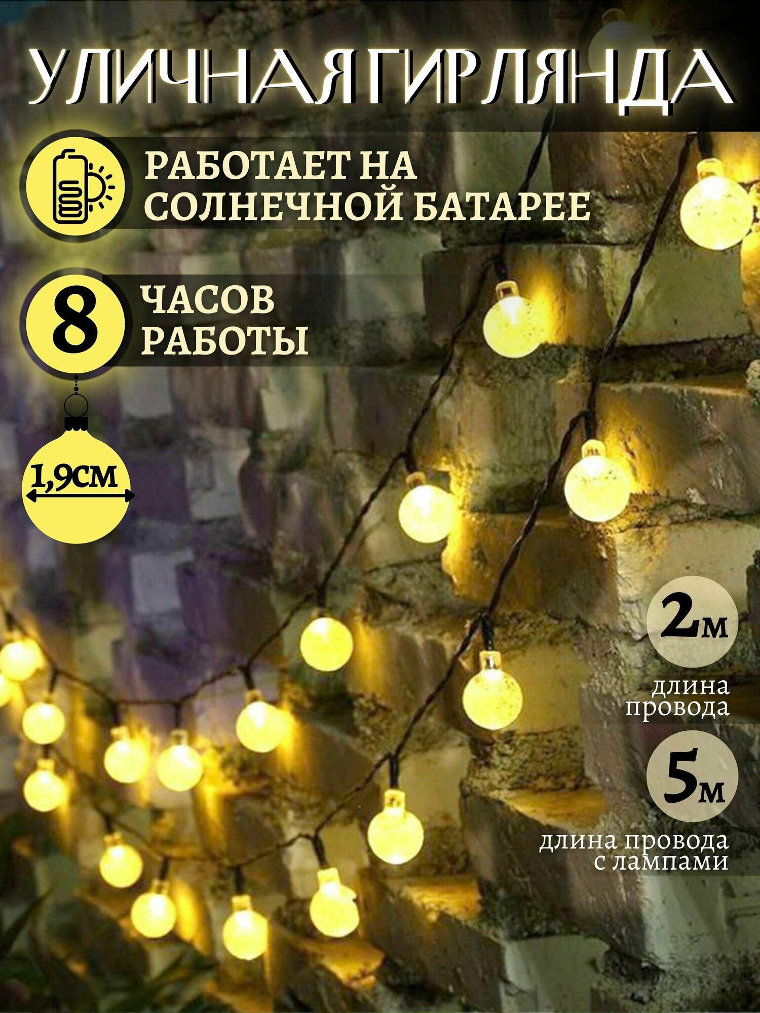 Уличная гирлянда, на солнечной батарее, садовая, шарики 50 шт, 5+2м интересное: