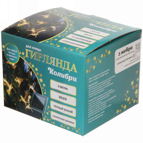 Гирлянда для улицы «Колибри» 3 м 20 ламп LED чёрный провод, 2 реж.,IP-55, Теплый белый (солнечная батарея) интересное:
