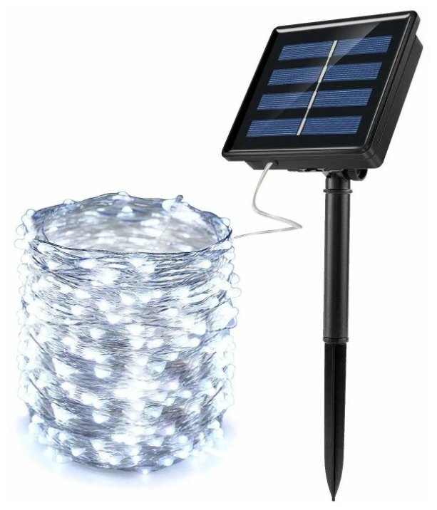 Купить Светодиодная гирлянда нить Белый на солнечной батареи 100 ламп 10 метров 8 режимов