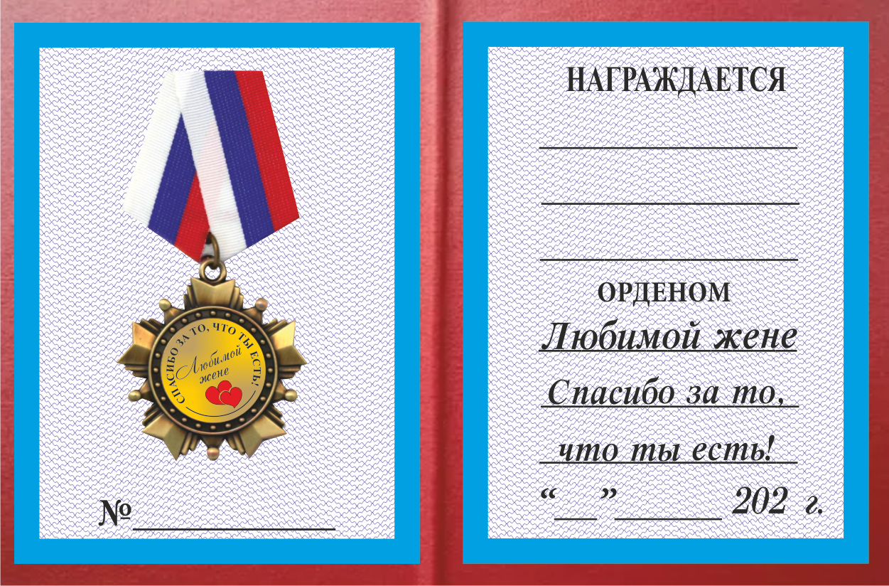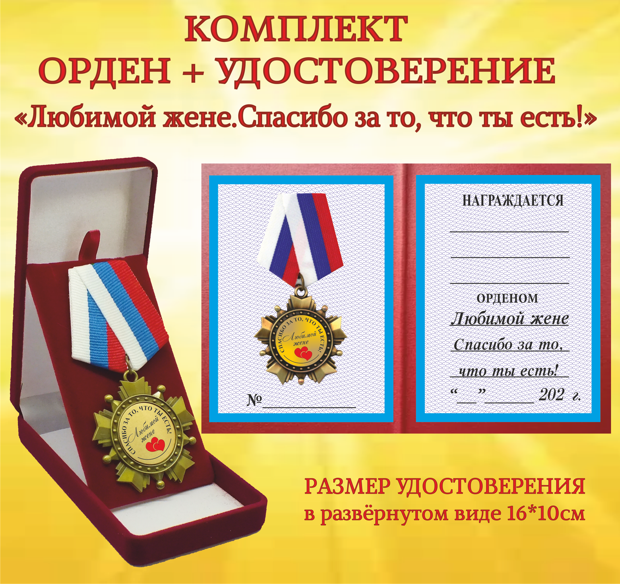 Купить Подарочный Орден медаль и удостоверение "Любимой жене. Спасибо за то, что ты есть"