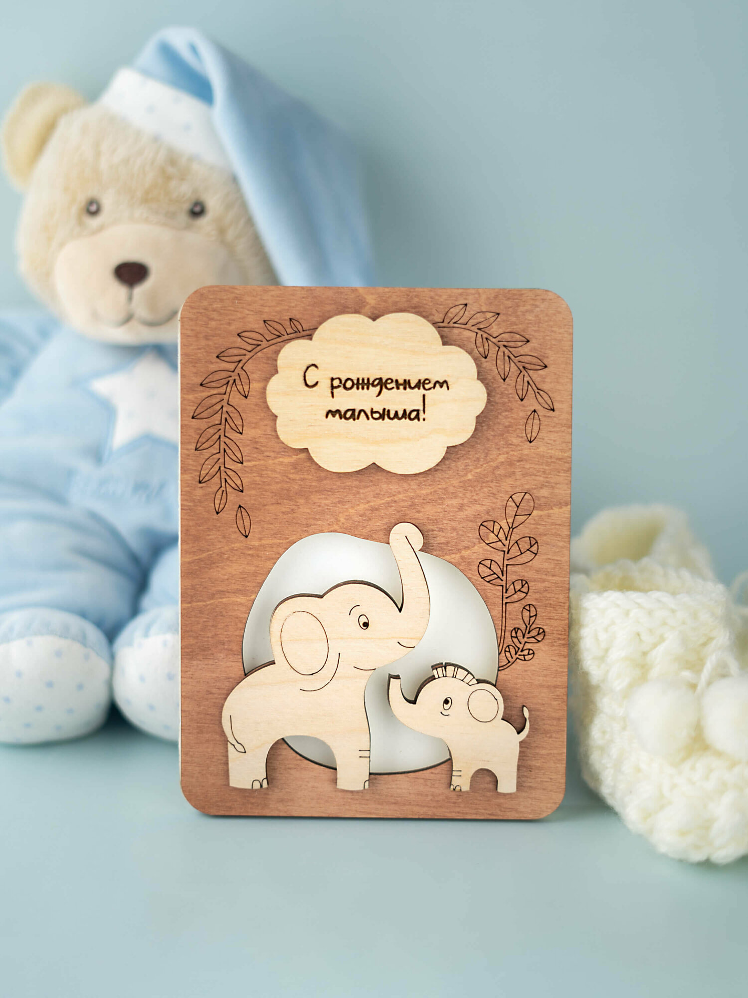 Деревянная открытка на рождение ребенка "Слоны", 17х12 см