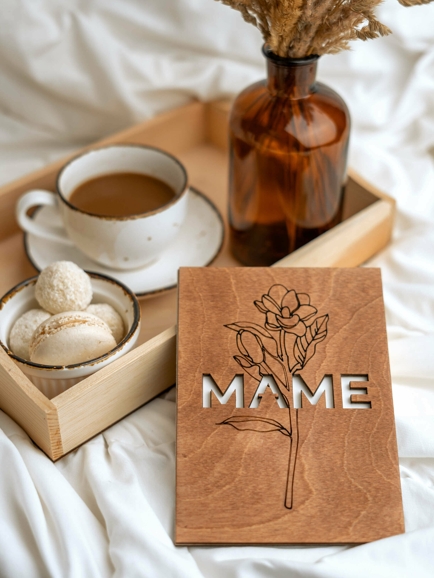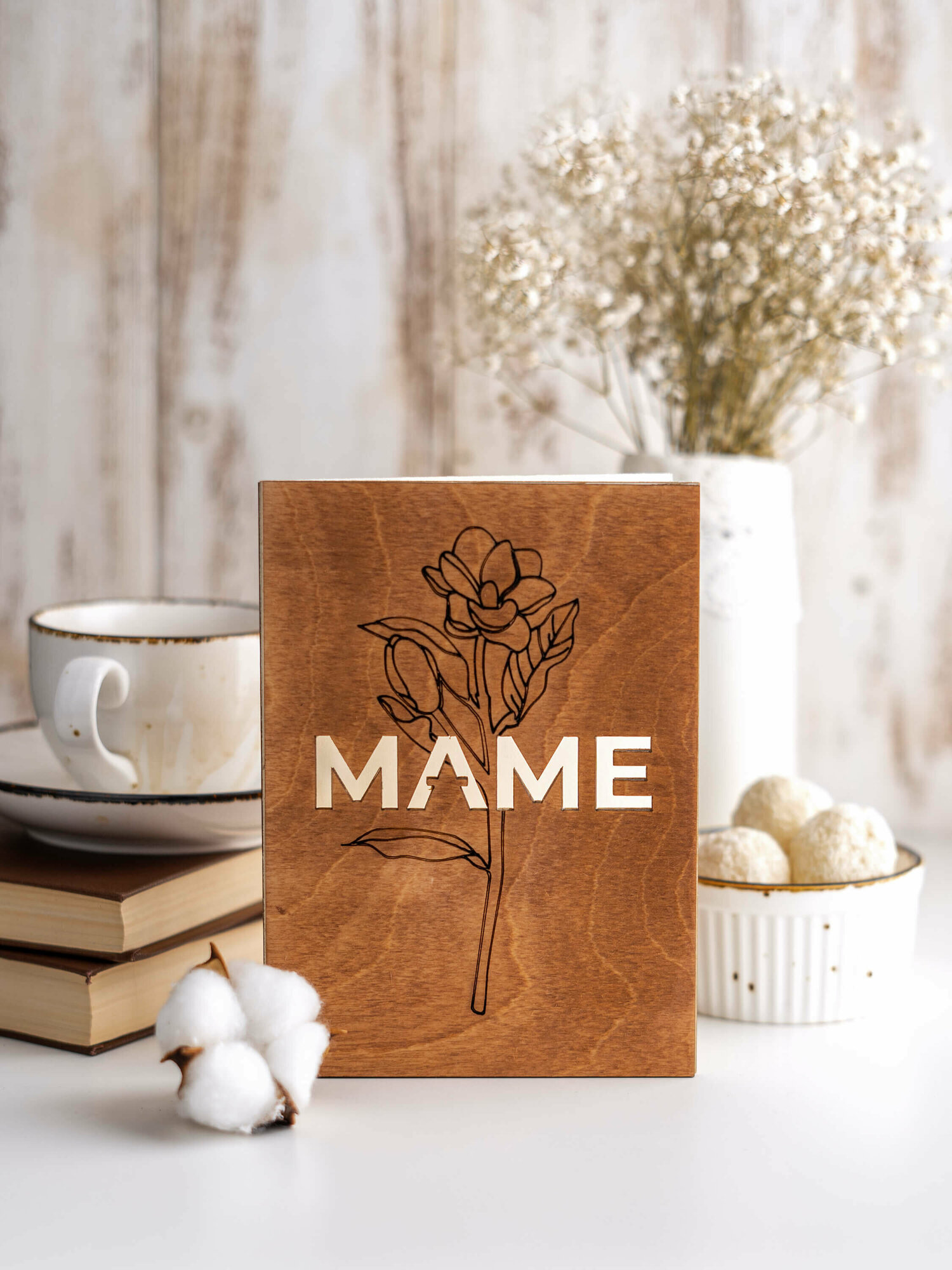 | Подробная комплектация | Деревянная открытка Маме без надписи внутри |
