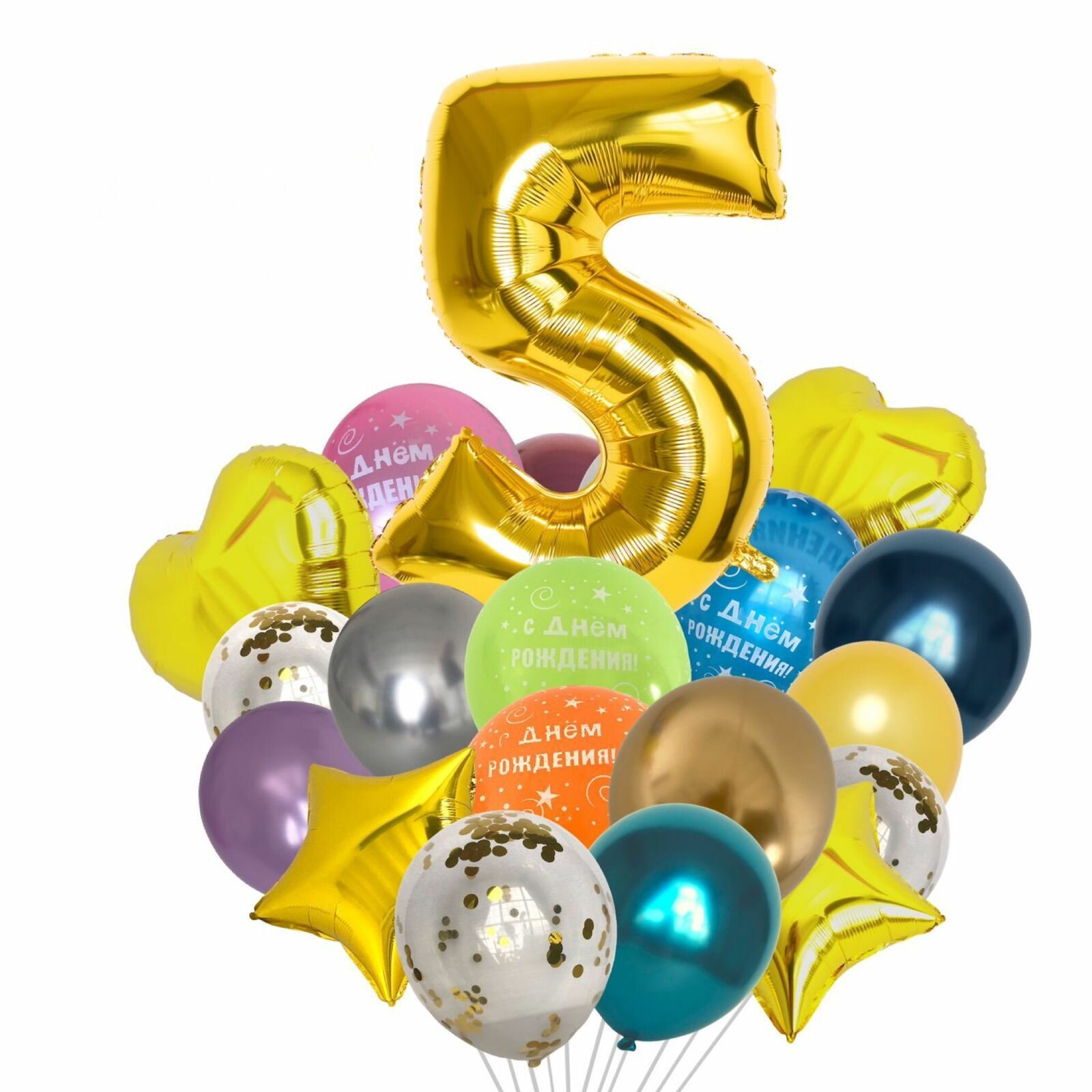Купить Набор/букет воздушных шаров С днем рождения с цифрой "5" золото 21 штука